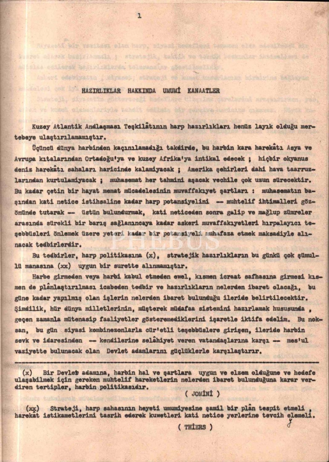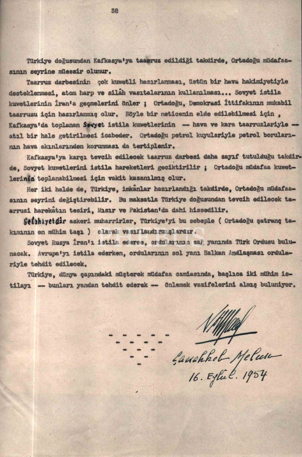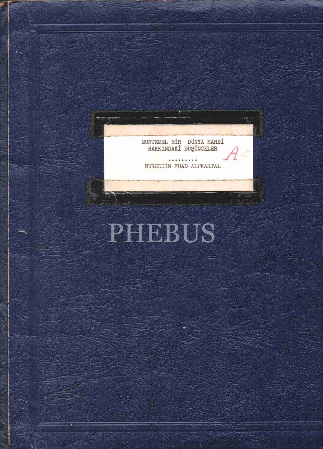 Asker kökenli Çanakkale Mebusu Nureddin Fuad Alpkartal´ın Başvekile sunmak için hazırladığı MUHTEMEL BİR DÜNYA HARBİ HAKKINDAKİ DÜŞÜNCELER, 1954, 38 sayfa, harita ekli, 23x29 cm