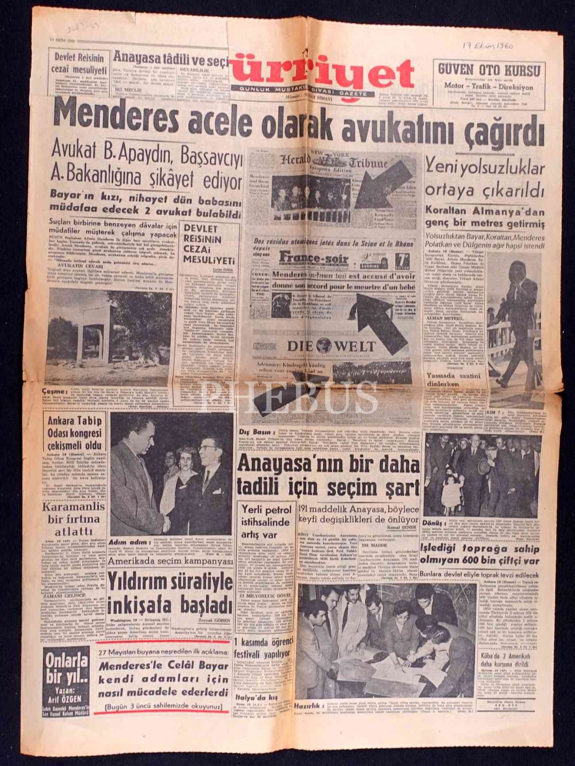 "Menderes acele olarak avukatını çağırdı" manşetli, 17 Ekim 1960 tarihli HÜRRİYET gazetesi, 42x57 cm, ön sayfanın sol üst köşesi kesilmiş haliyle