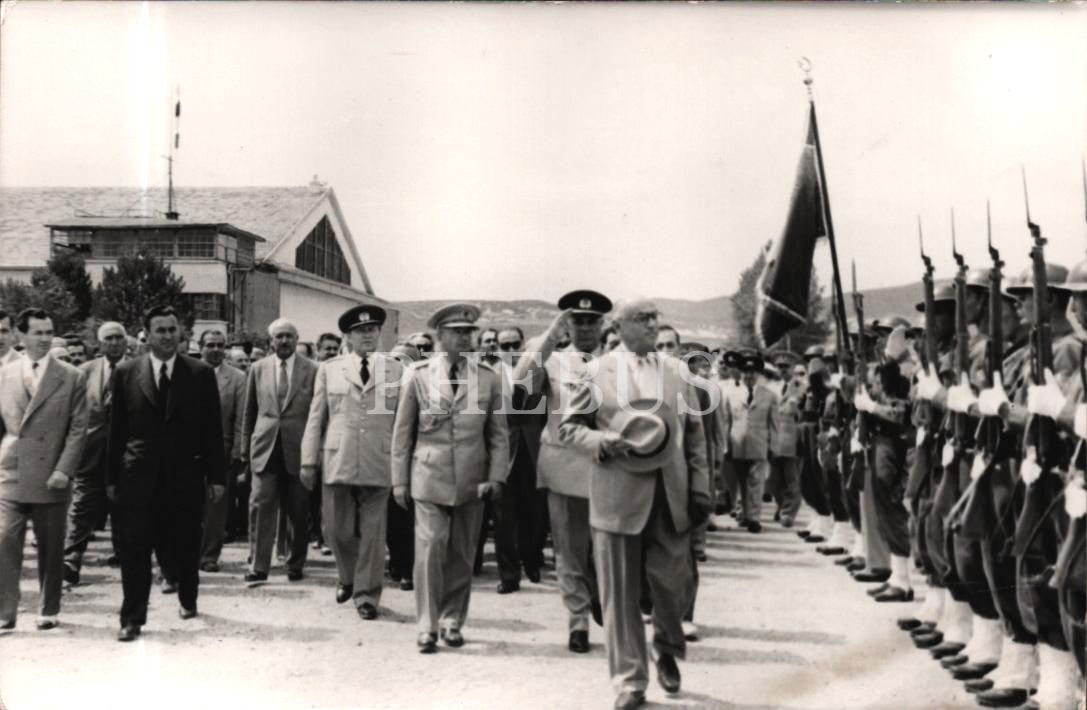 Celal Bayar ve beraberindekiler karşılama törenindeki askeri selamlarken, 14x9 cm