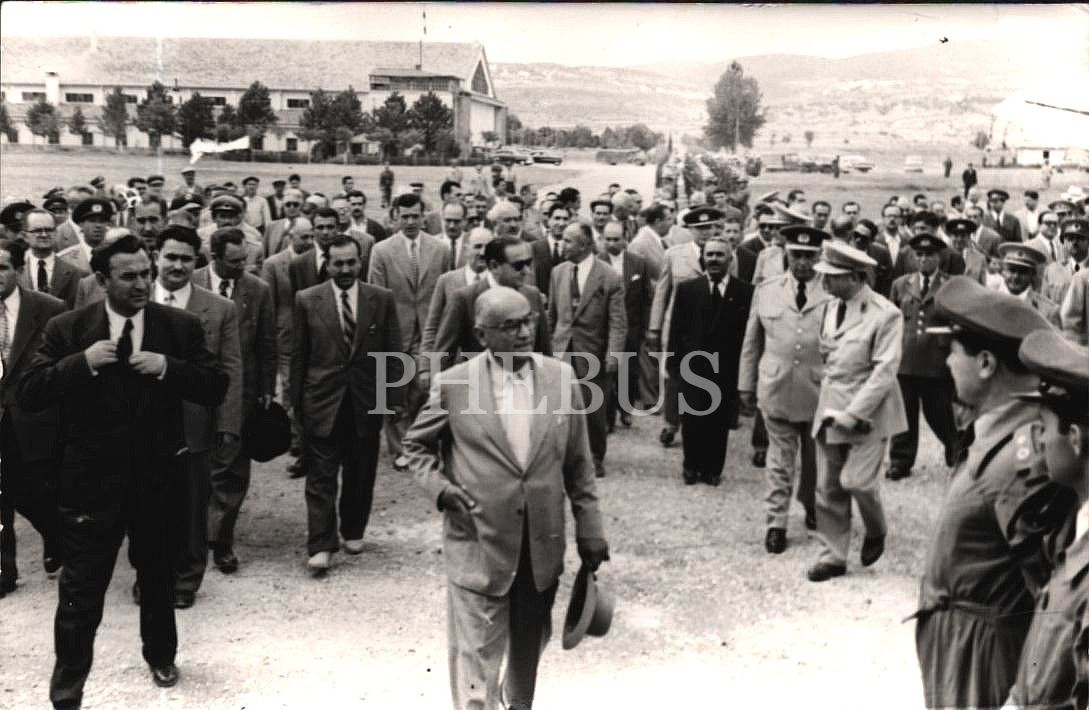 Celal Bayar bir şehir ziyaretinde askerler ve siviller eşliğinde yürürken, 14x9 cm