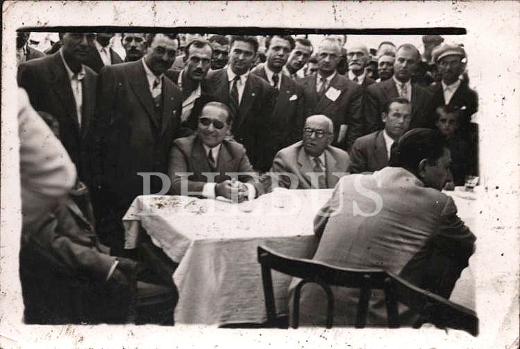 Adnan Menderes, Celal Bayar ve Hasan Polatkan, Çifteler/Eskişehir ziyaretinde, "Foto Yaşar Aktürk - Çifteler" damgalı, 10x7 cm
