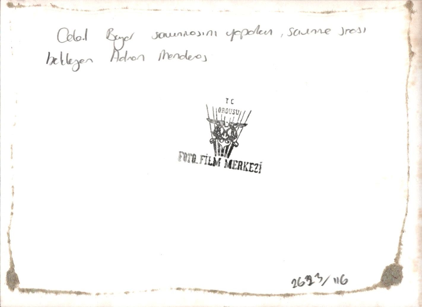 Celal Bayar savunmasını yaparken, arkada savunma sırasını bekleyen Adnan Menderes görülmekte, "T.C. Ordusu Foto Film Merkezi" kaşeli, 18x13 cm