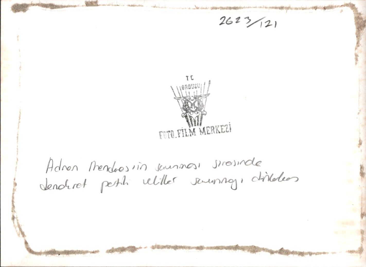 Adnan Menderes´in savunmasını dinleyen Demokrat Partili vekiller, arkada Fatin Rüştü Zorlu görülmekte, "T.C. Ordusu Foto Film Merkezi" kaşeli, 18x13 cm
