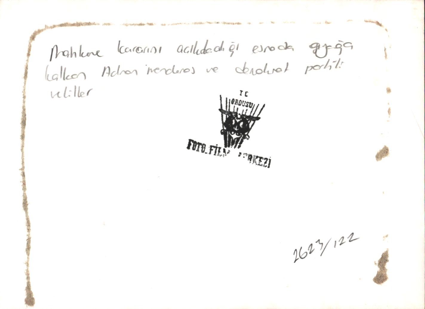 Kararların açıklandığı esnada ayağa kalkan Adnan Menderes ve Demokrat Partili vekiller, "T.C. Ordusu Foto Film Merkezi" kaşeli, 18x13 cm