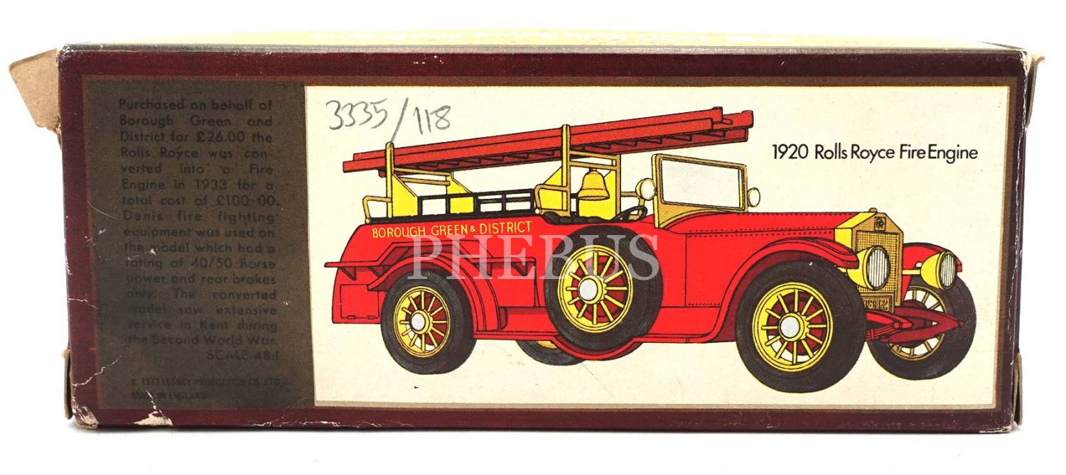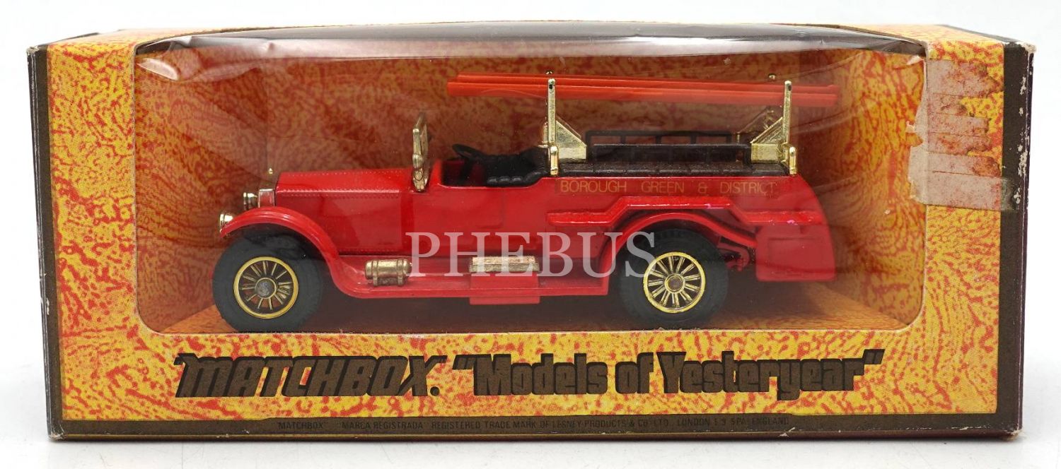 İngiliz malı MATCHBOX marka Y-6 1920 ROLLS ROYCE FIRE ENGINE model oyuncak araç, kutusu yıpranmış haliyle, kutu: 16x7x4 cm