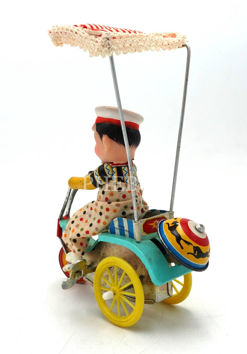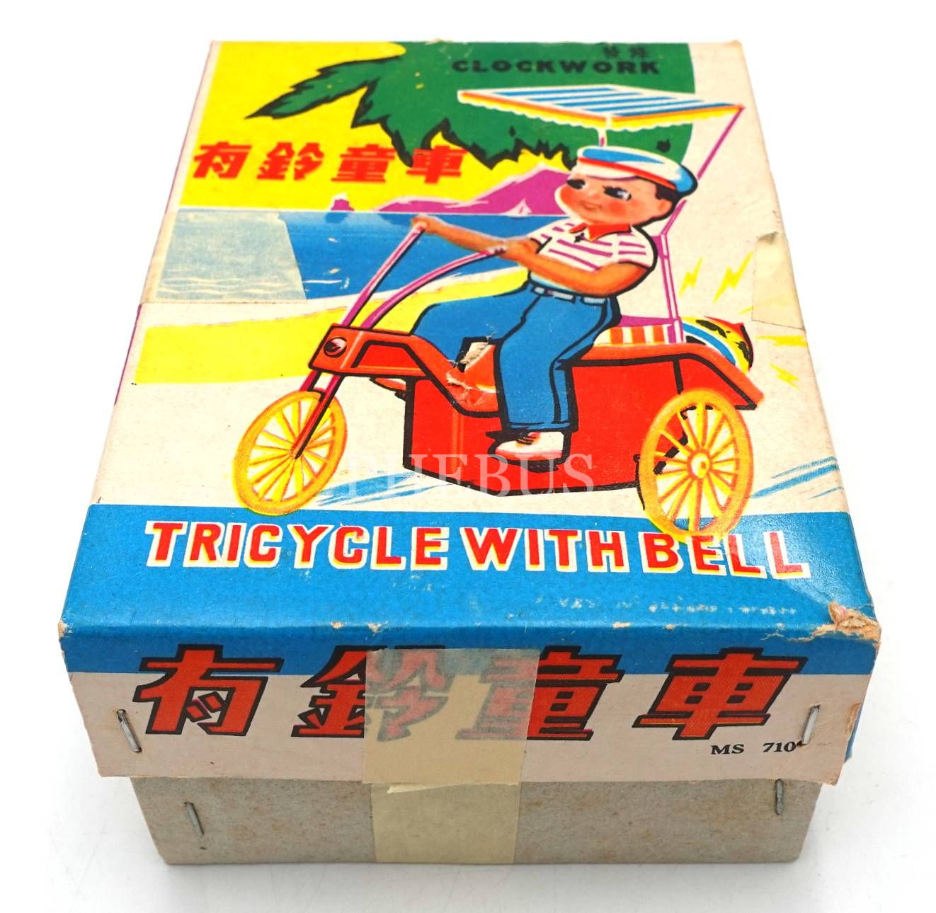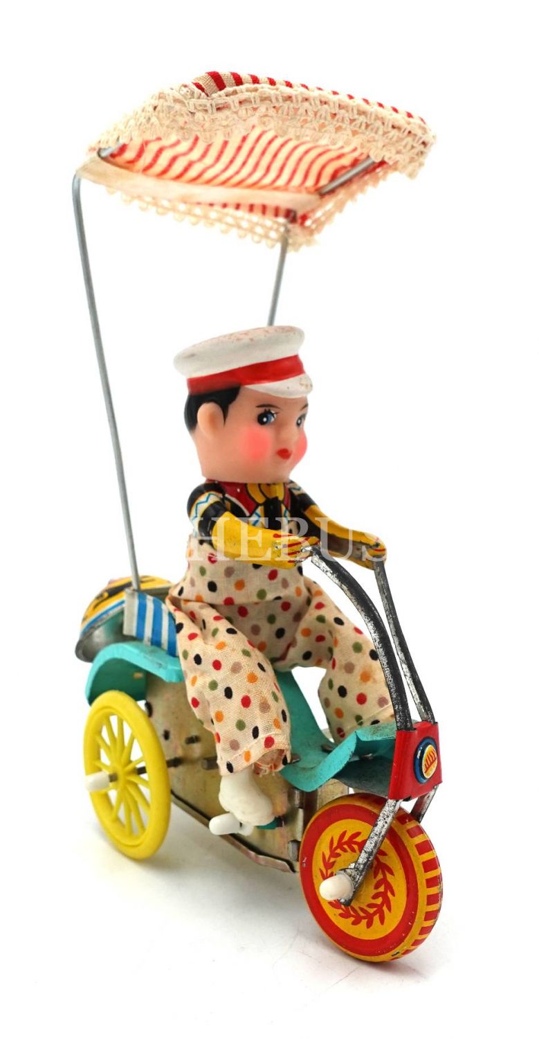 Döneminin orijinal kutusunda Çin malı kurmalı bisikletli çocuk, kutusu bantlanmış haliyle, 17x15x3 cm, kutu: 15x11x8 cm