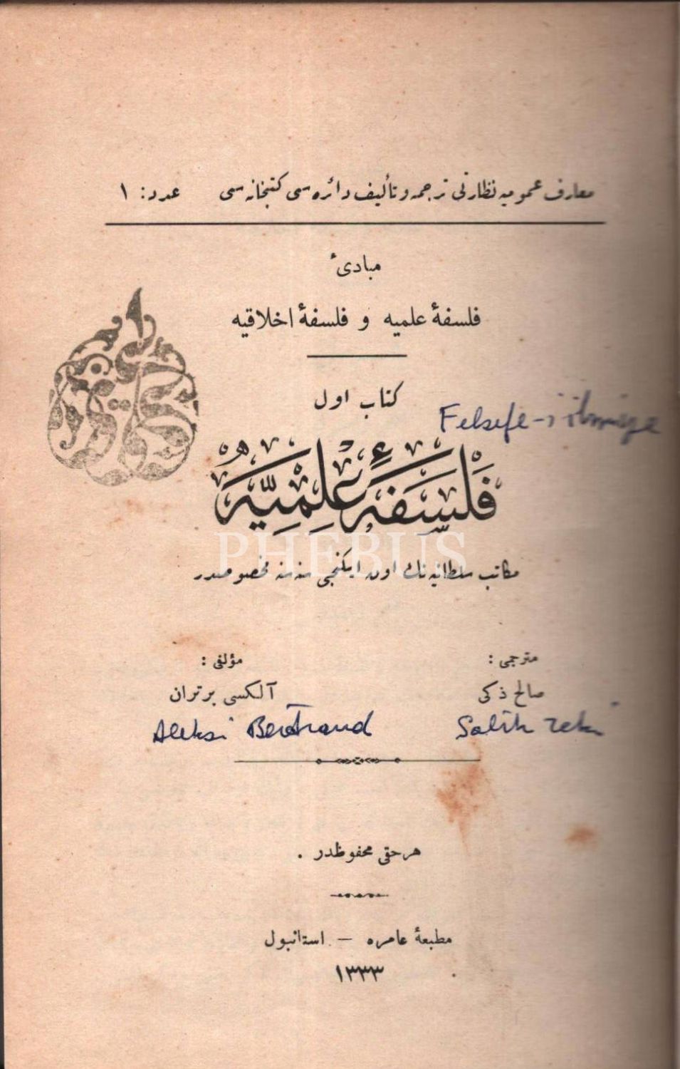 FELSEFE-İ İLMİYYE [Bilim Felsefesi], Alexis Bertrand, çev. Salih Zeki, Amire Matbaası, İstanbul 1333, 302 s., 14x20 cm