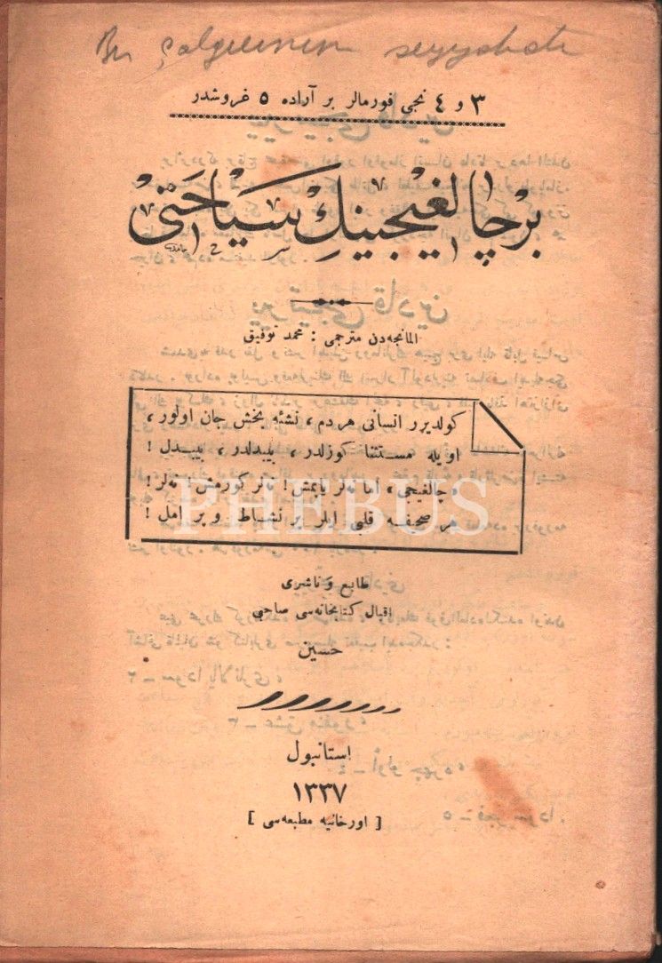 BİR ÇALGICININ SEYÂHATİ- Alfred Müller ile Fridrih Şüller´in Mâceraları (formalar halinde), Almancadan çev. Mehmed Tevfik, Orhaniye Matbaası, İstanbul 1337, 14x21 cm