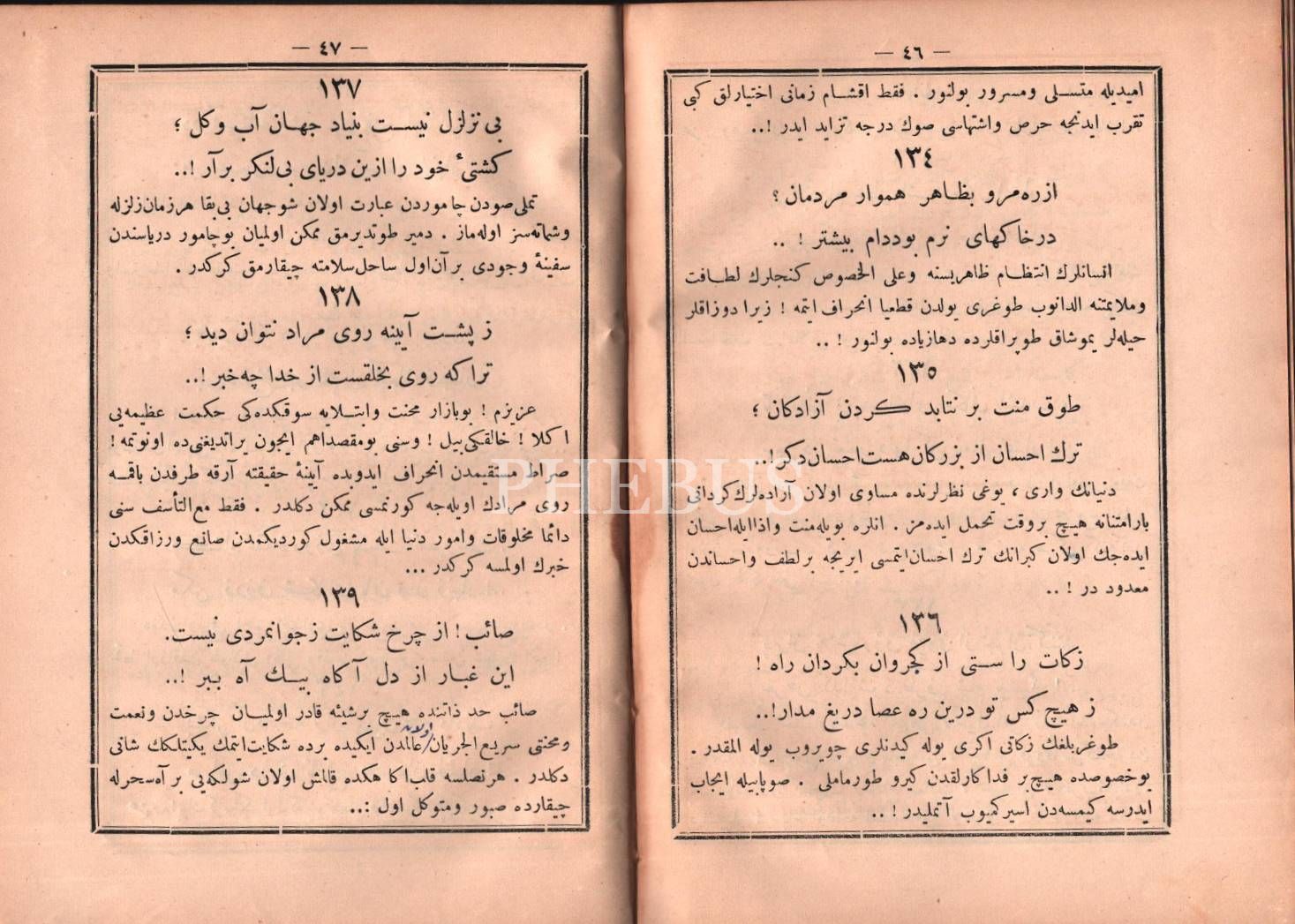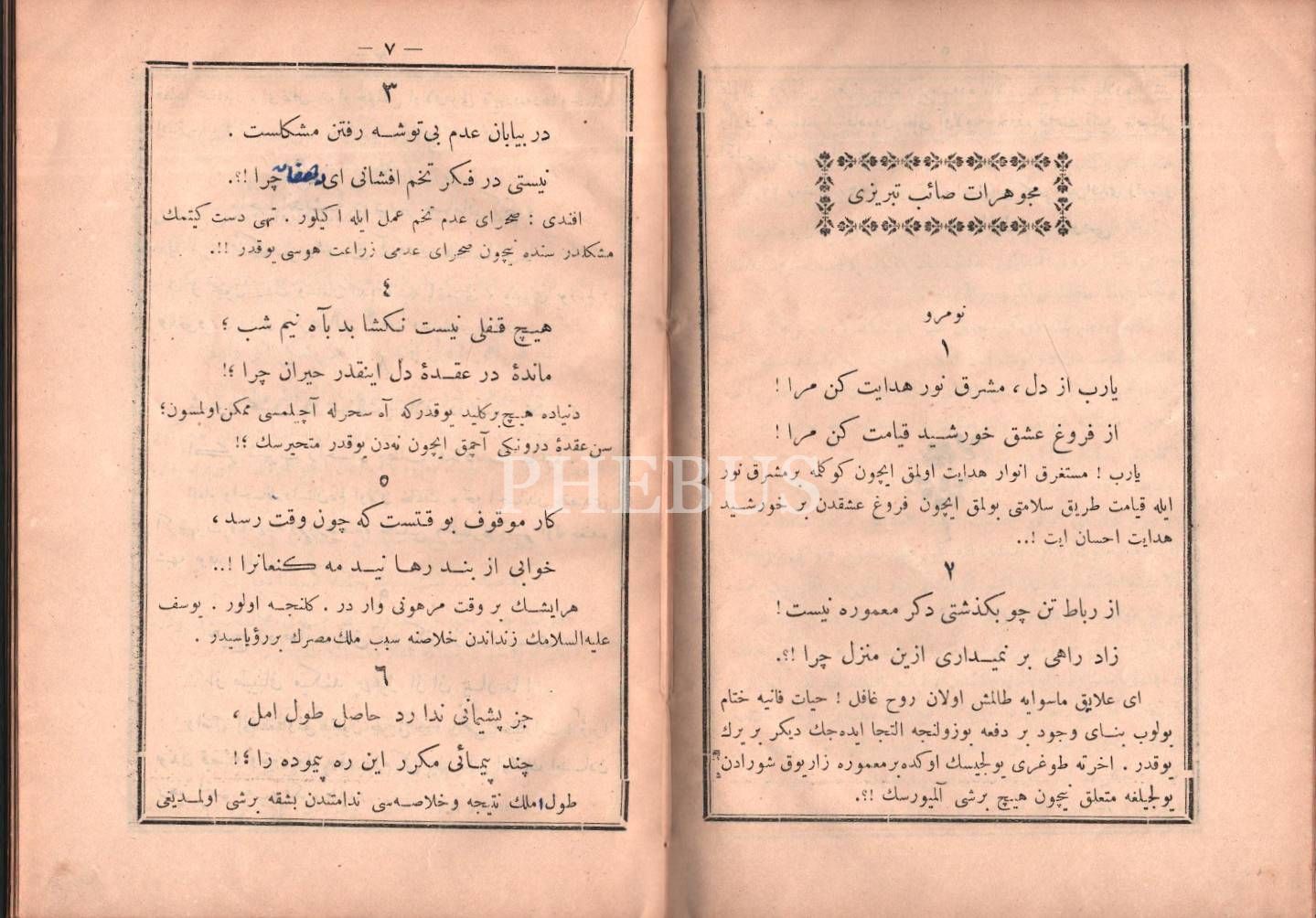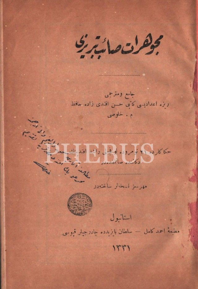 Son devir düşünür ve idarecilerinden Mehmed Ali Ayni´ye ithaflı ve imzalı MÜCEVHERÂT-I SÂİB-İ TEBRÎZÎ, derl. ve çev. M. Hulusi, Ahmed Kâmil Matbaası, İstanbul 1331, 64 s., 14x20 cm