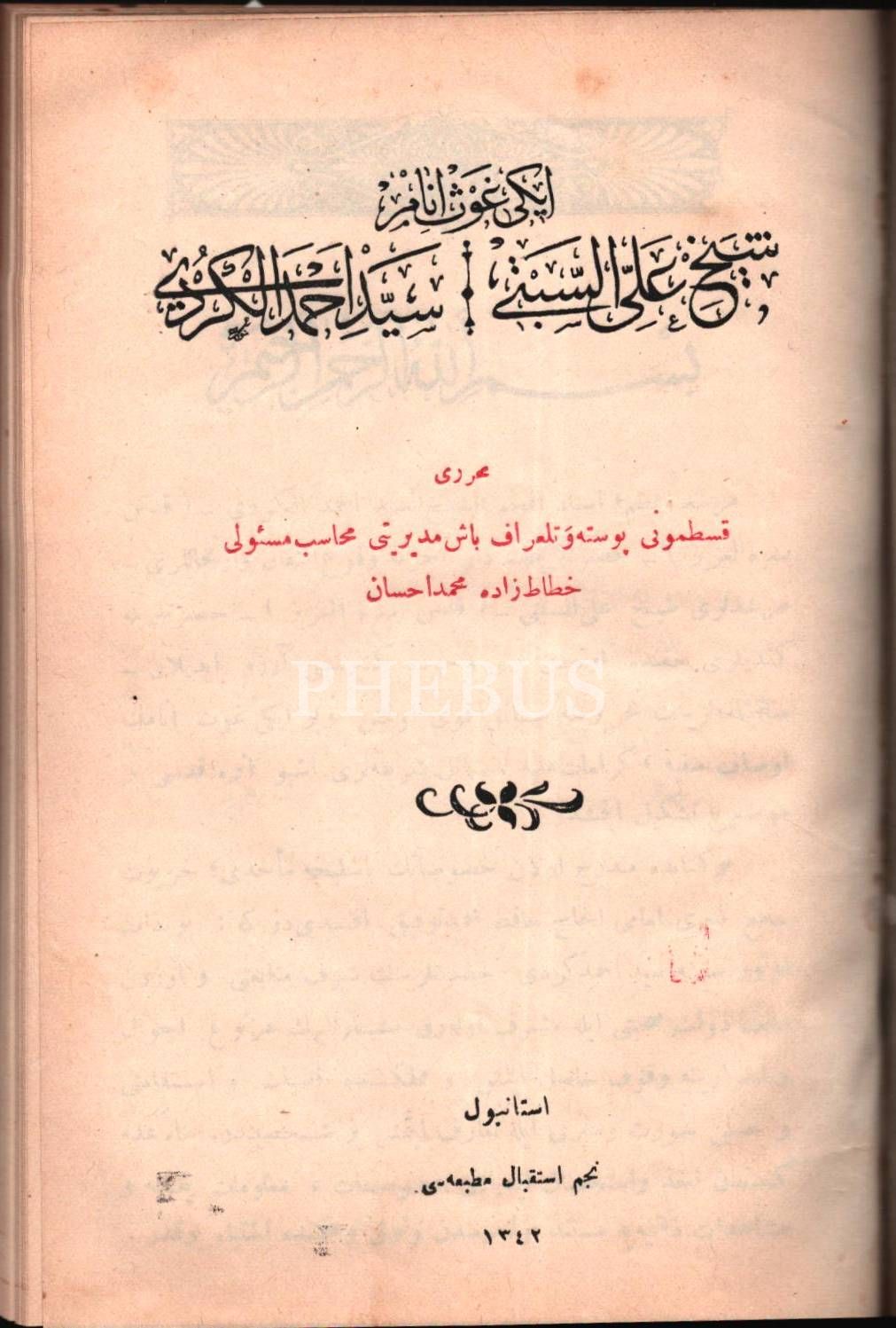 İKİ GAVS-I ENÂM: ŞEYH ALİ ES-SEBTÎ-SEYYİD AHMED EL-KÜRDÎ, Hattatzâde Mehmed İhsan, Necm-i İstikbâl Matbaası, İstanbul 1342, 64 s.; Tomar-ı Turuk-ı Aliyye´nin 4. Kitâbı SÛFÎ VE TASAVVUF, Amire Matbaası, İstanbul 1340, 61 s., 14x19 cm *Ciltte ayrıca Latin harfli olarak, İsmail Fennî´ye ait KÜÇÜK KİTAPTA BÜYÜK MEVZULAR kitabı da bulunmaktadır.