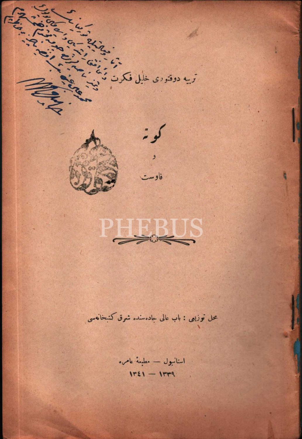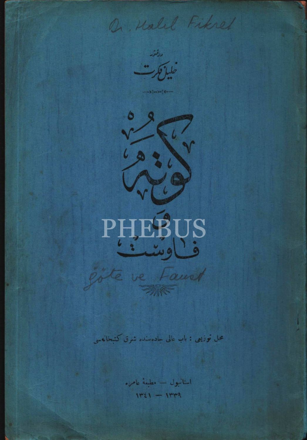 Halil Fikret'ten son devir düşünür ve idarecilerinden Mehmed Ali Ayni´ye ithaflı ve imzalı GOETHE VE FAUST, Halil Fikret, Amire Matbaası, İstanbul 1341, 68 s., 17x24 cm
