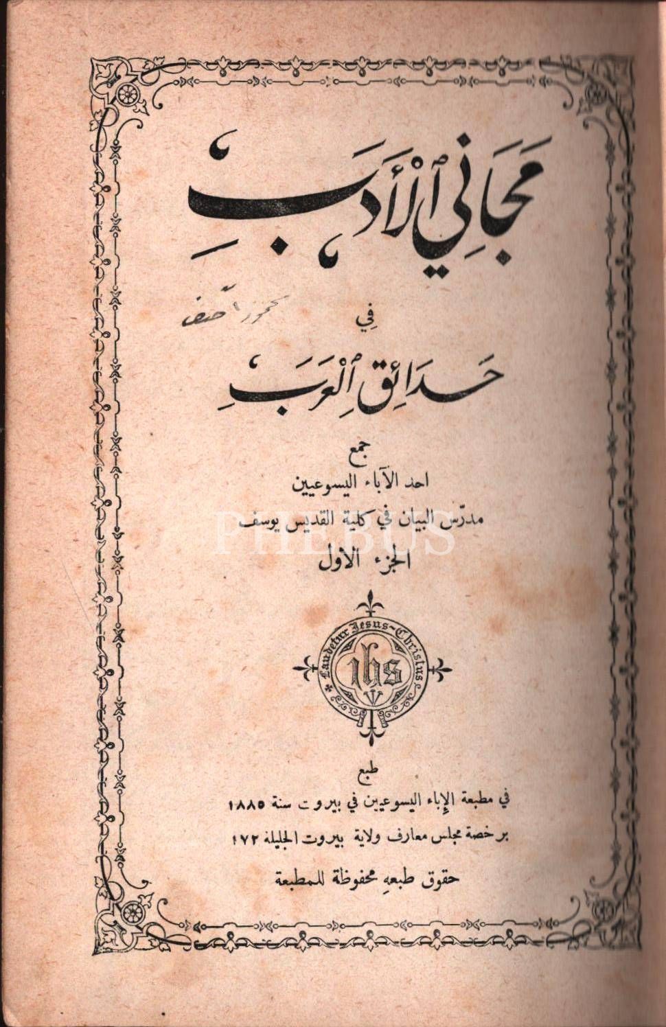 Arapça MECÂNİİ´L-EDEB FÎ HADÂİKİ´L-ARAB (1. Kısım), derl. Ehadü´l-Âbâi´l-Yesûiyyîn [Luvîs Şeyho el-Yesûî], Beyrut 1885, 320 s., 13x20 cm