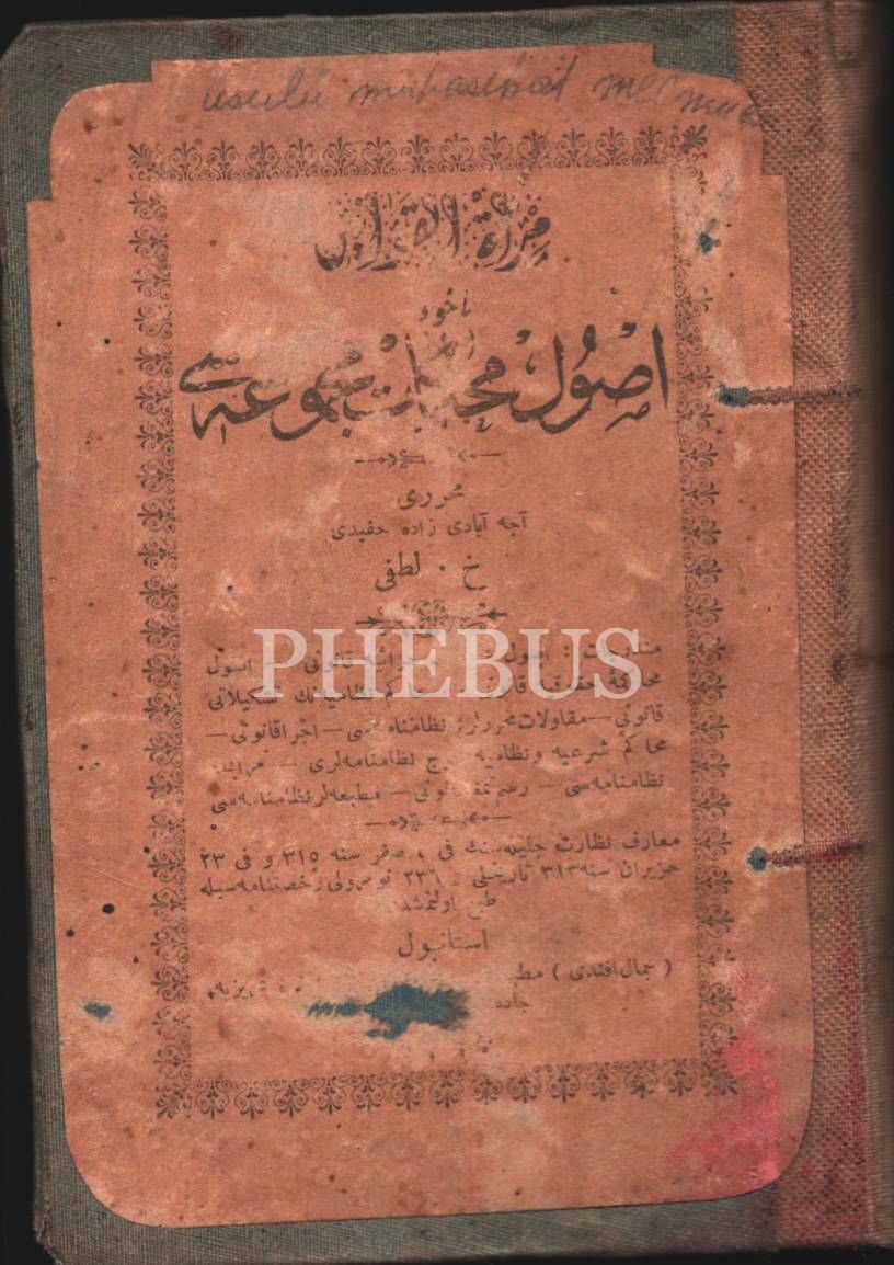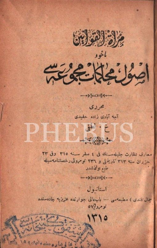 MİR´ÂTÜ´L-KAVÂNÎN YÂHÛD USÛL-İ MUHÂKEMÂT MECMÛASI [Kanunlar veya Muhakeme Usulü Derlemesi], H. Lütfi, Cemal Efendi Matbaası, İstanbul 1315, 608 s., 10x15 cm