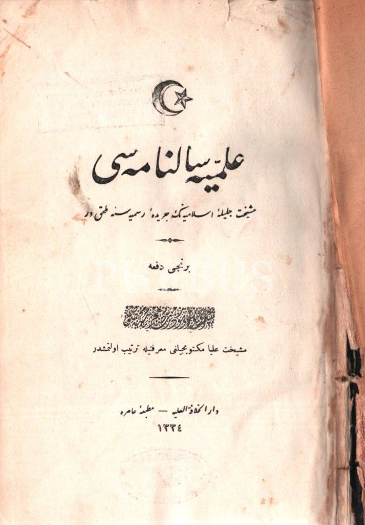 Tuğralı ve ay yıldızlı cildinde İLMİYYE SÂLNÂMESİ, Amire Matbaası, İstanbul 1334, 736 s., 16x24 cm