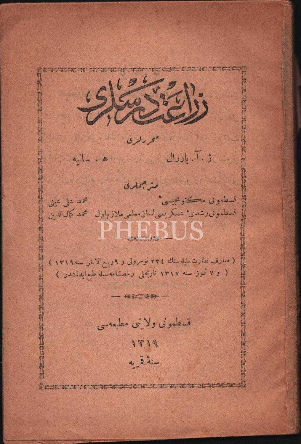 ZİRÂAT DERSLERİ, J. A. Barrall-H. Saniye, çev. Mehmed Ali Ayni-Mehmed Kemaleddin, Kastamonu Vilayeti Matbaası, 1319, 155 s., 14x20 cm, ciltsiz ve sayfaları açılmamış haliyle