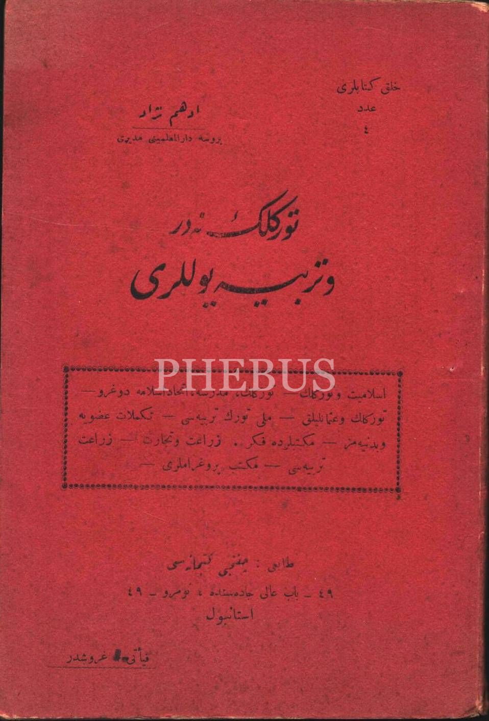 "İslamiyet ve Türklük- Türklük, Medrese, İttihad-ı İslam´a Doğru- Türklük ve Osmanlılık- Milli Türk Terbiyesi- Tekemmülat-ı Uzviyye ve Bedeniyyemiz- Mekteblerde Fikir- Ziraat ve Ticaret- Ziraat Terbiyesi- Mekteb Programları"