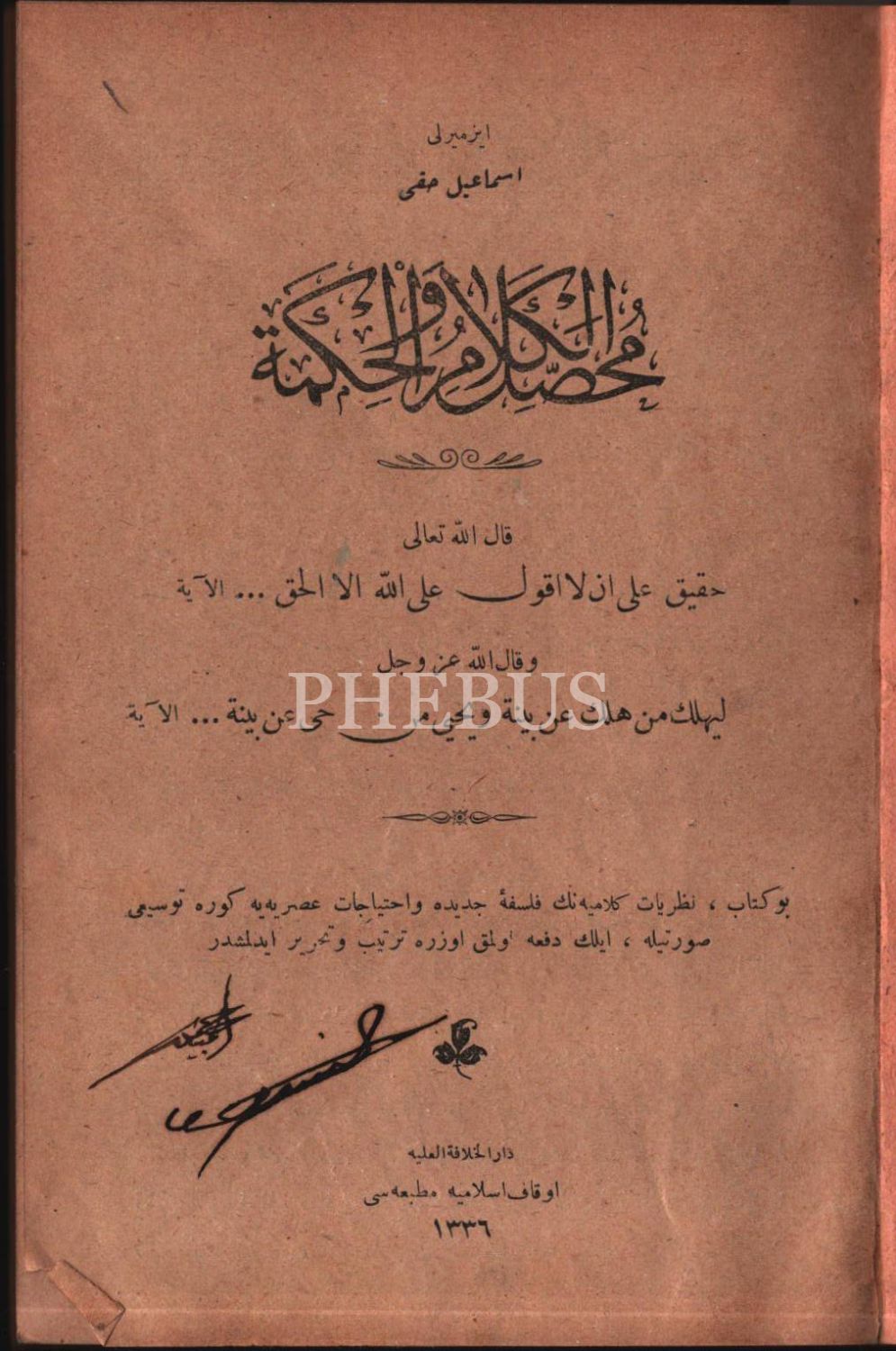 MUHASSALÜ´L-KELÂM VE´L-HİKME, İzmirli İsmail Hakkı, Evkaf-ı İslamiye Matbaası, İstanbul 1336, 201 s., 14x20 cm