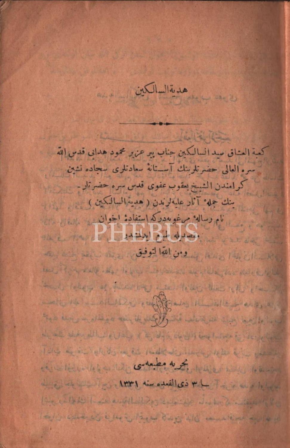 HEDİYYETÜ´S-SÂLİKÎN, Yakub Afvî ve TUHFETÜ´S-SÂLİKÎN, Mehmed Şehabeddin, Bahriye Matbaası, 1331, 38 s., 14x20 cm, arka kapak sayfası kopuk haliyle