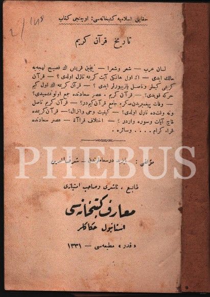 TÂRÎH-İ KUR´ÂN-I KERÎM, Bayezid Dersiamı Şerefeddin, Kader Matbaası, İstanbul 1331, 45 s., 12x18 cm, ciltsiz haliyle