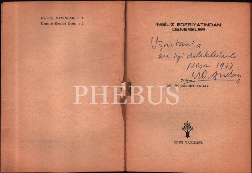 İNGİLİZ EDEBİYATINDAN DENEMELER, Çev. Melih Cevdet Anday, 1964, Oluş Yayınevi, 80 sayfa, 12x16 cm… İthaflı ve imzalı…