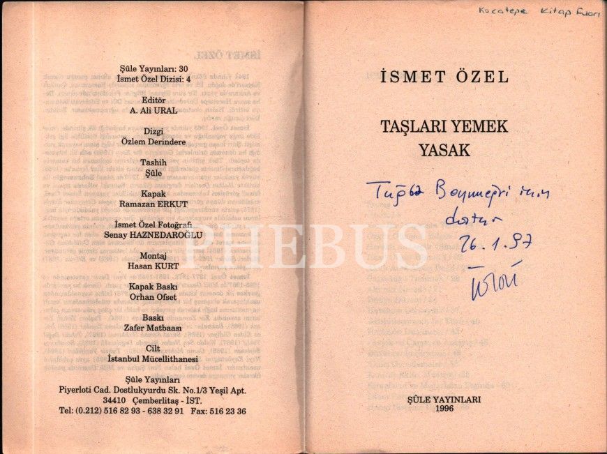 TAŞLARI YEMEK YASAK, İsmet Özel, 1996, Şule Yayınları, 126 sayfa, 13x19,5 cm… İthaflı ve imzalı…