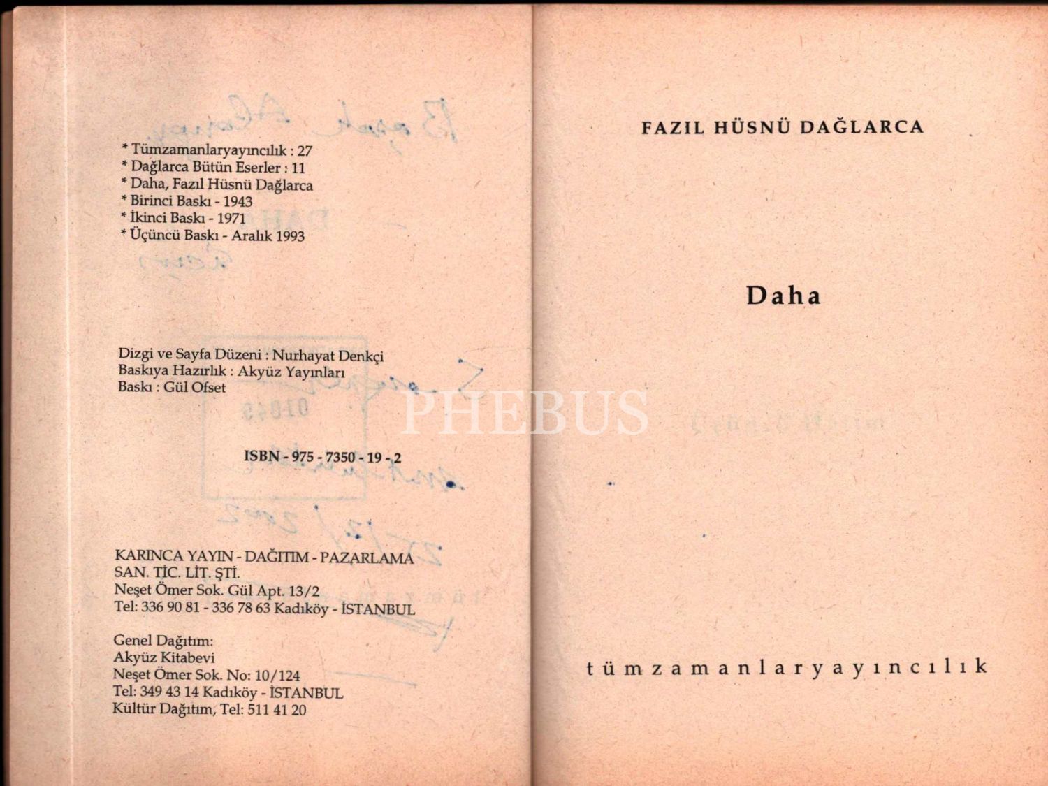 DAHA - ÇAKIRIN DESTANI, Fazıl Hüsnü Dağlarca, 1993, Tümzamanlaryayıncılık, 172+148 sayfa, 13x19 cm… İthaflı ve imzalı…