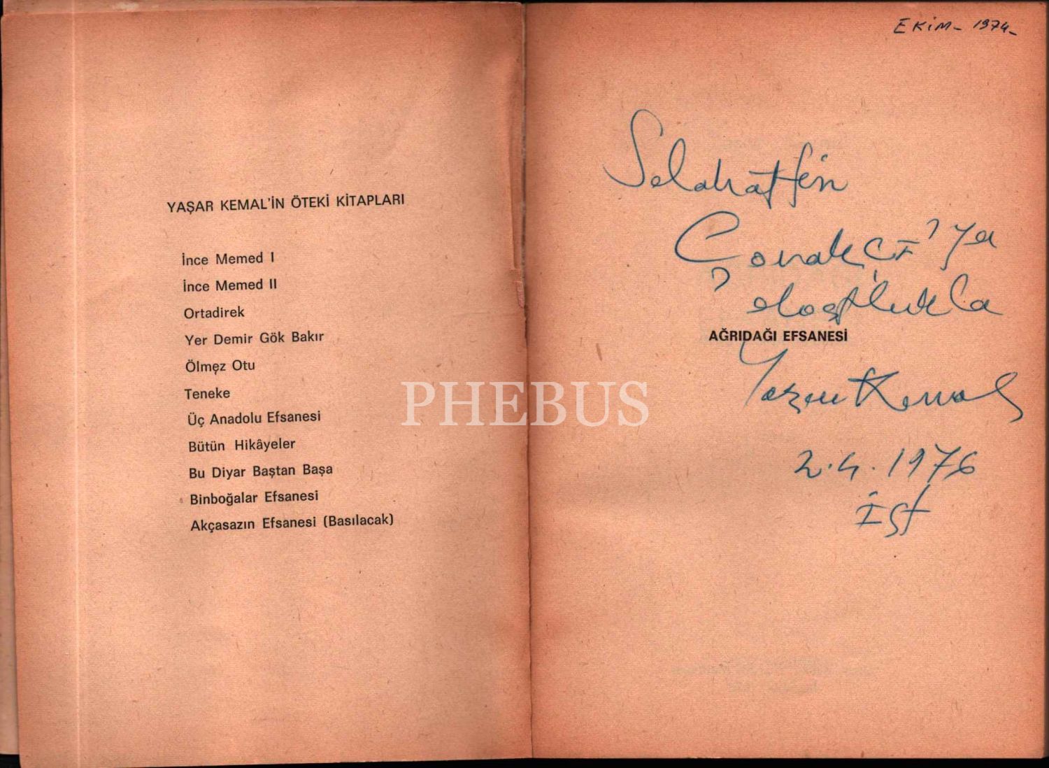 AĞRI DAĞI EFSANESİ, Yaşar Kemal, 1972, Cem yayınevi, 144 sayfa, 13,5x19,5 cm… İthaflı ve imzalı…