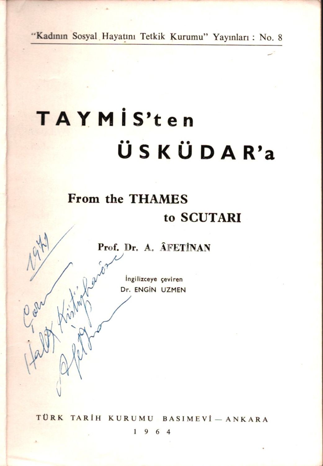 TAYMİS´TEN ÜSKÜDAR´A (FROM THE THAMES TO SCUTARI), Prof Dr. Âfet İnan, 1964, TTK Basımevi, 88 sayfa, 14x19,5 cm… İthaflı ve imzalı…