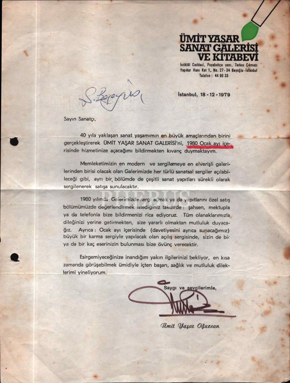 Şair Ümit Yaşar Oğuzcan´ın (1926 - 1984) "Ümit Yaşar Sanat Galerisi ve Kitabevi"nin açılışı dolayısıyla sanatçılara gönderdiği davet mektubu…