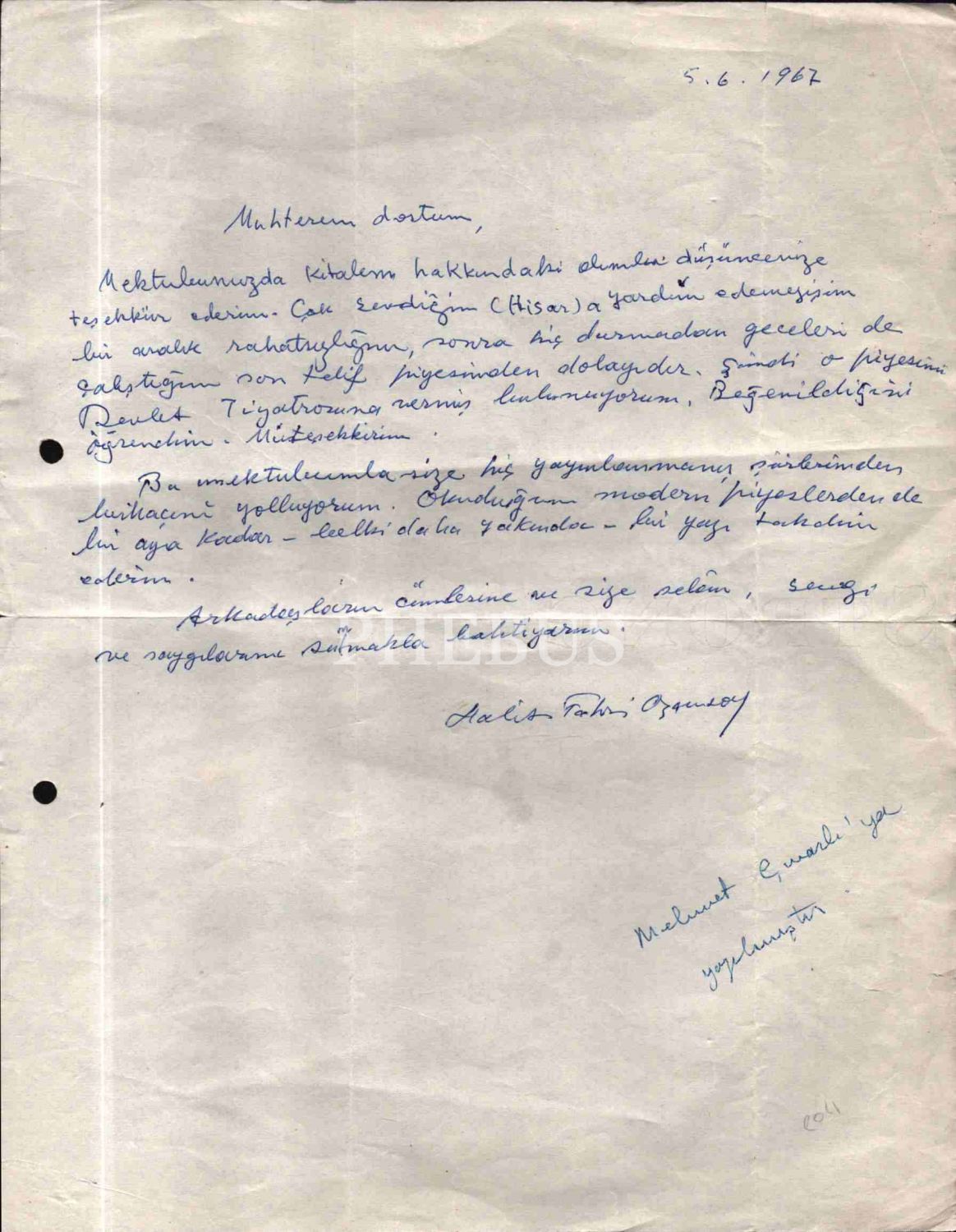 Beş Hececilerden, şair ve yazar Halit Fahri Ozansoy’un (1891 – 1971), Hisar dergisi kurucularından Mehmet Çınarlı´ya (1925 - 1999) yazdığı, 5.6.1967 tarihli mektubu…