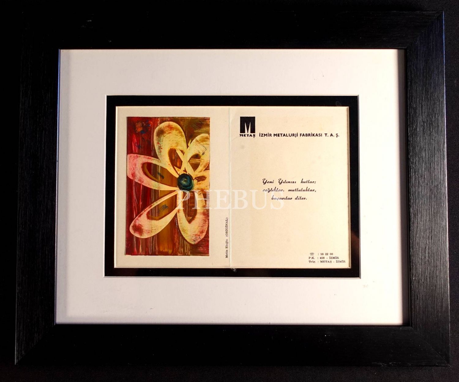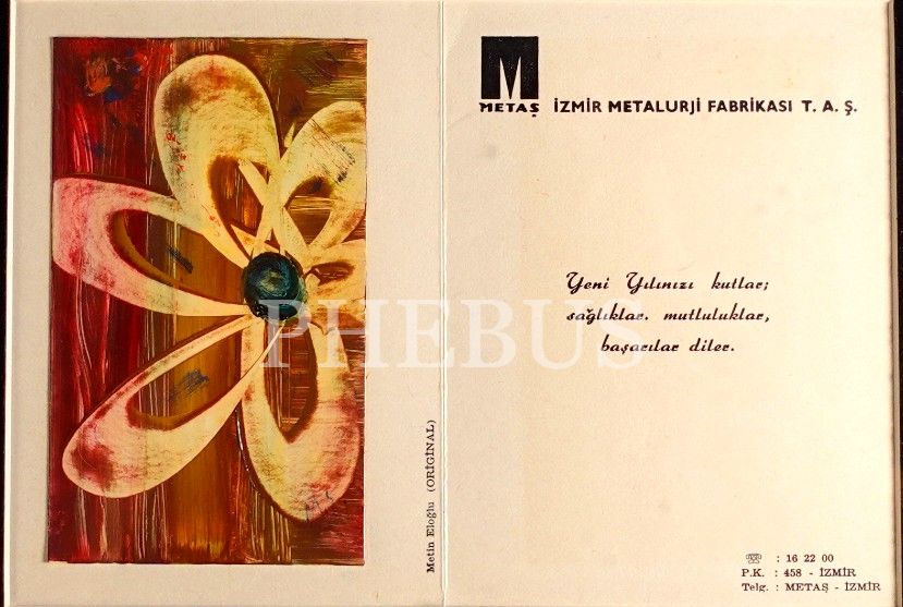 İzmir´in önde gelen sanayi kuruluşlarından Metaş Metalurji Fabrikası´nın, hatırlı müşterileri için hazırladığı, Metin Eloğlu imzalı, karton üzerine yağlıboya orijinal deseni yapıştırılmış yeni yıl kartı… Desen ölçüleri: 8,5x14 cm… Tebrik kartı ölçüleri: 24x17 cm…Çerçeve boyutları: 42x35 cm...