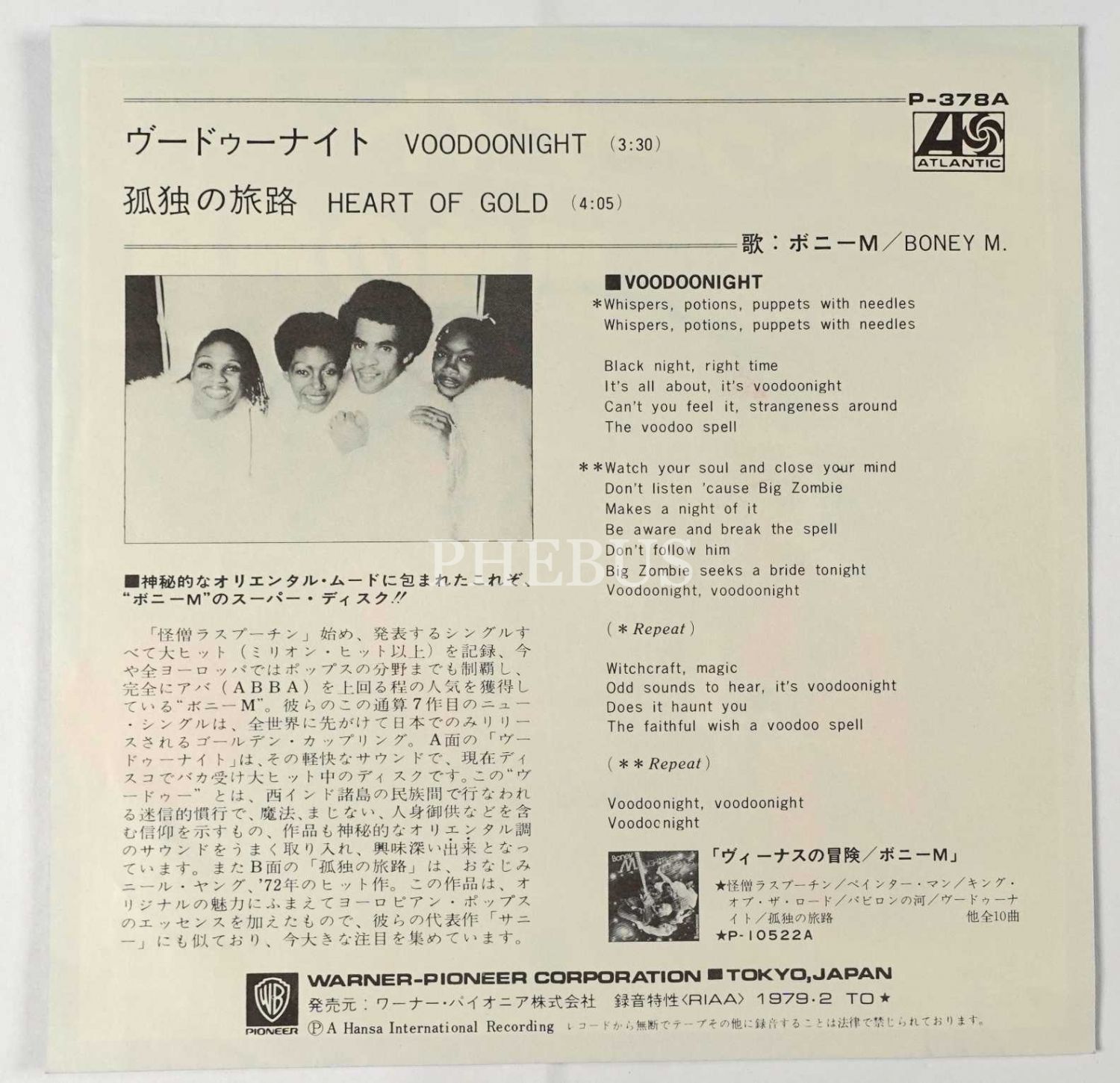 BONEY M. - Voodoo Night / Heart of Gold (Nightflight of teh Venus albümünden iki hit parça içermekte, Japonya Basımı)