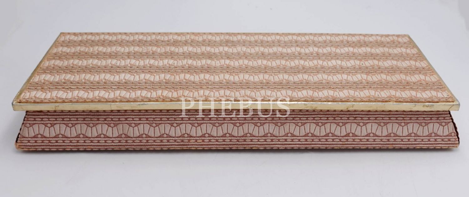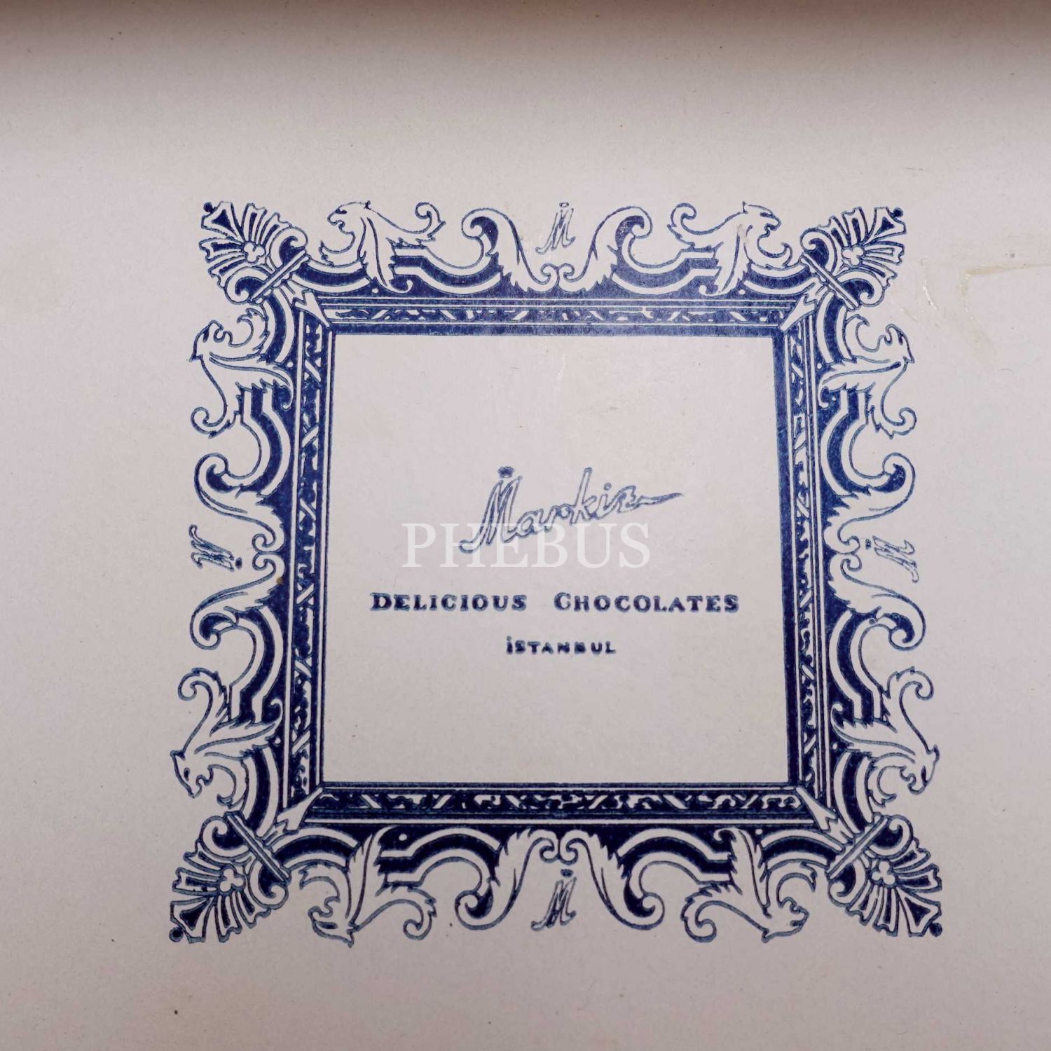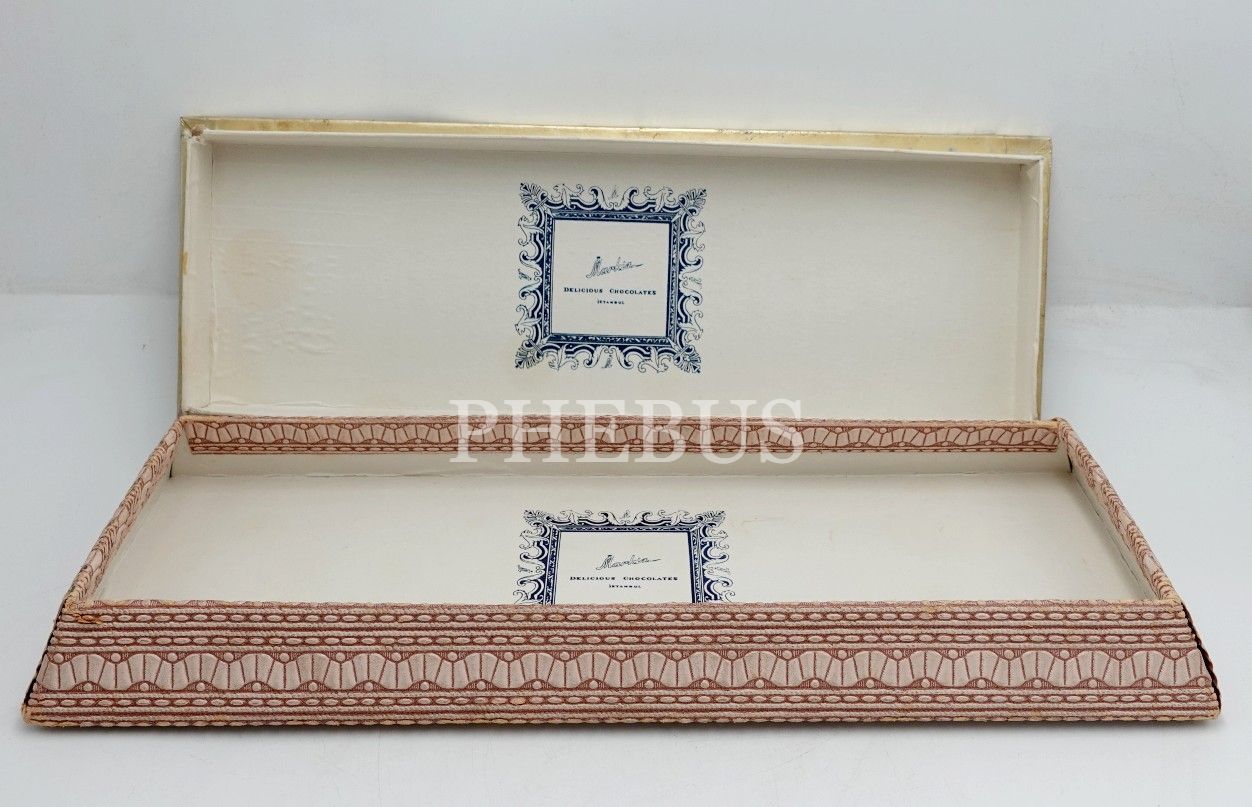 İç kapağında "Markiz (Delicious Chocolates) - İstanbul" yazılı, kumaş kaplı karton kutu, 37x13x5 cm