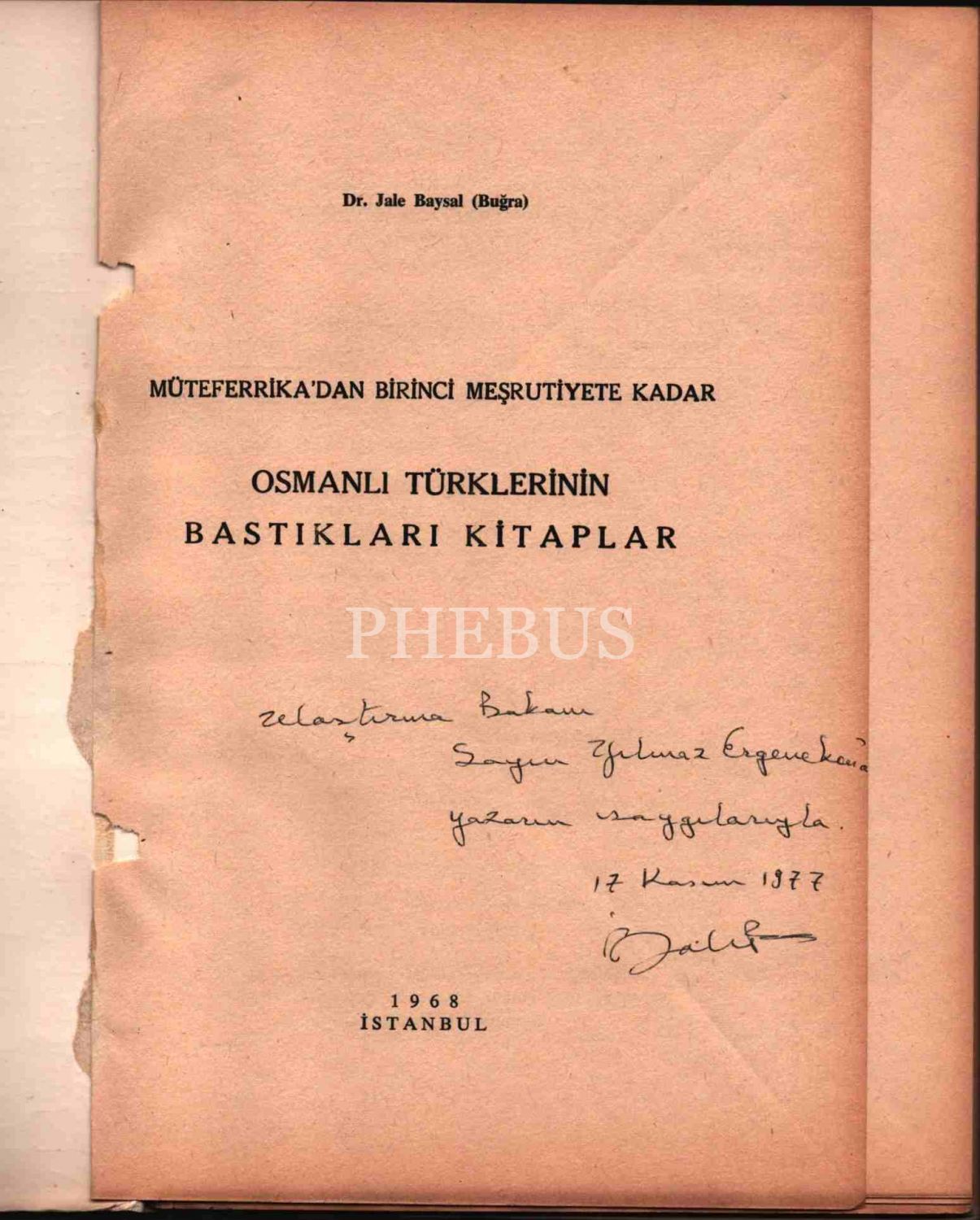 Dr. Jale Baysal (Buğra)´dan Ulaştırma Bakanı Yılmaz Ergenekon´a ithaflı ve imzalı MÜTEFERRİKA'DAN BİRİNCİ MEŞRUTİYETE KADAR OSMANLI TÜRKLERİNİN BASTIKLARI KİTAPLAR, İstanbul - 1968, 88 sayfa, 17x24 cm