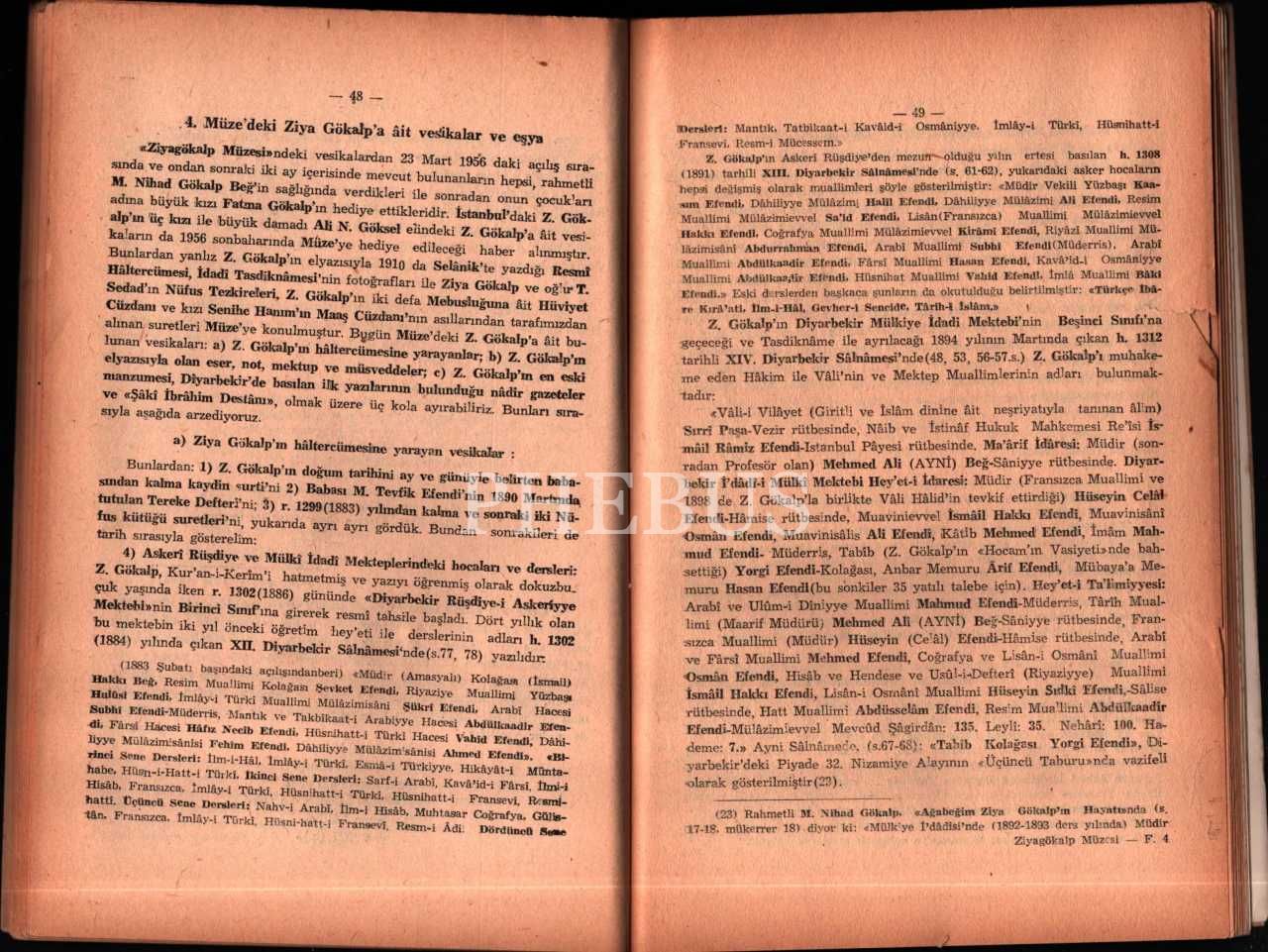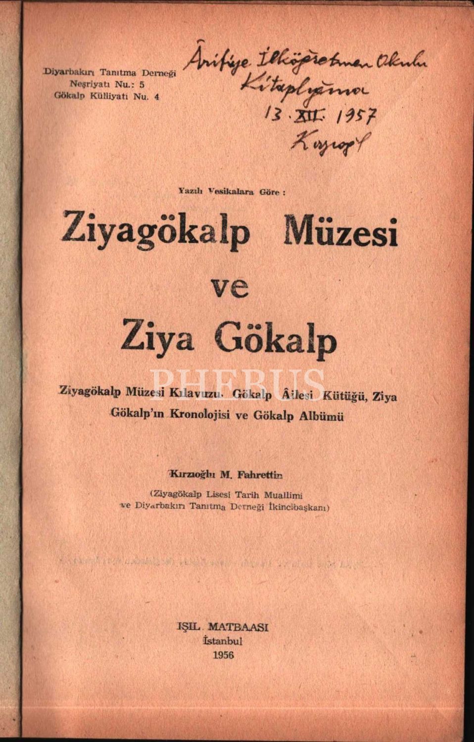 İthaf, "Ârifiye İlköğretmen Okulu Kitaplığına 13.XII.1957 Kırzıoğlu" şeklindedir. Kitap içerisinde katlanır levha halinde "Ziya gökalp Âilesi Kütüğü" ve "Ziyagökalp Müzesi Plânı" başlıklı ekler yer almaktadır.