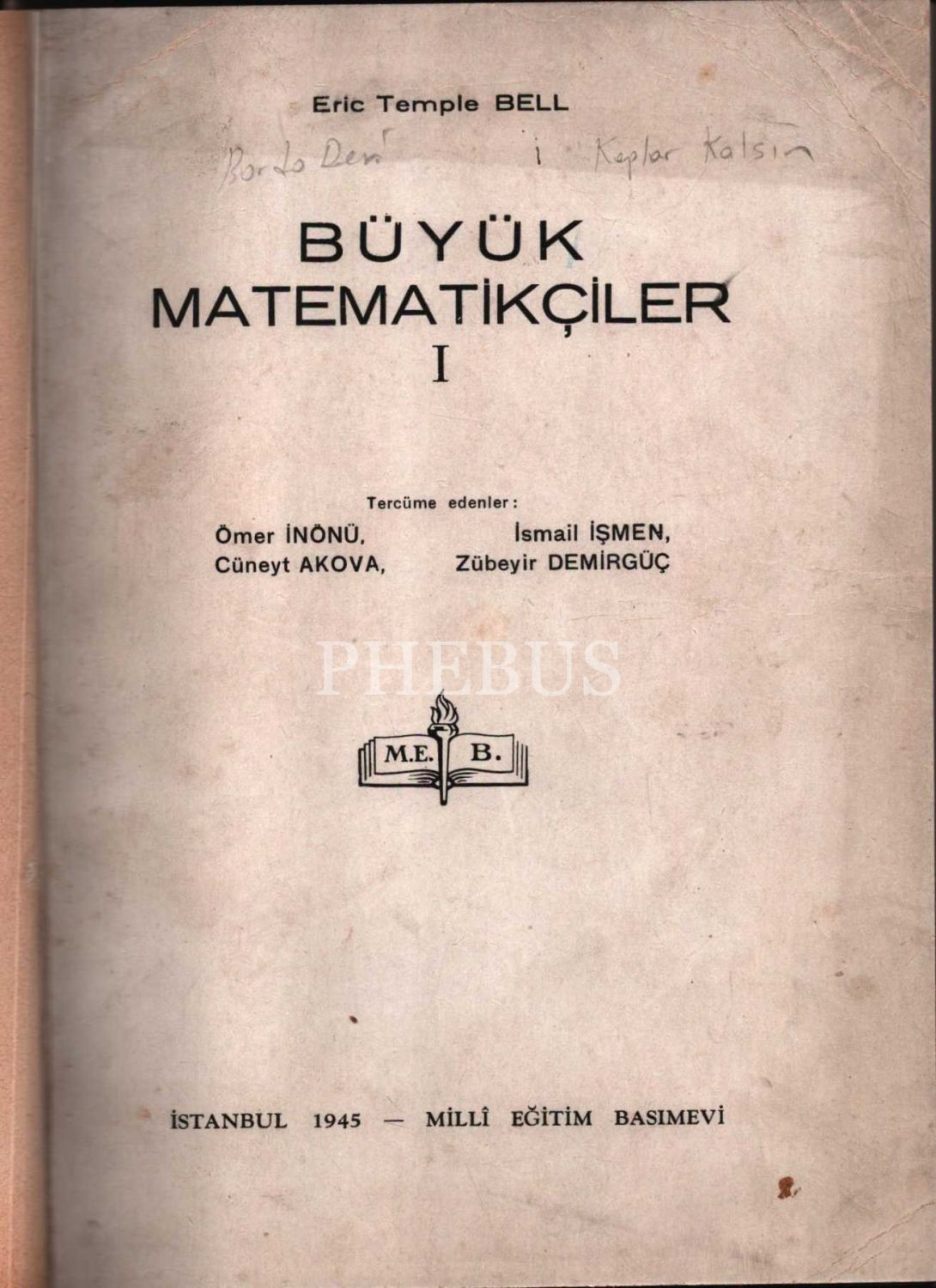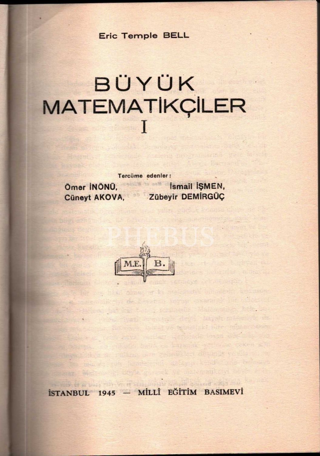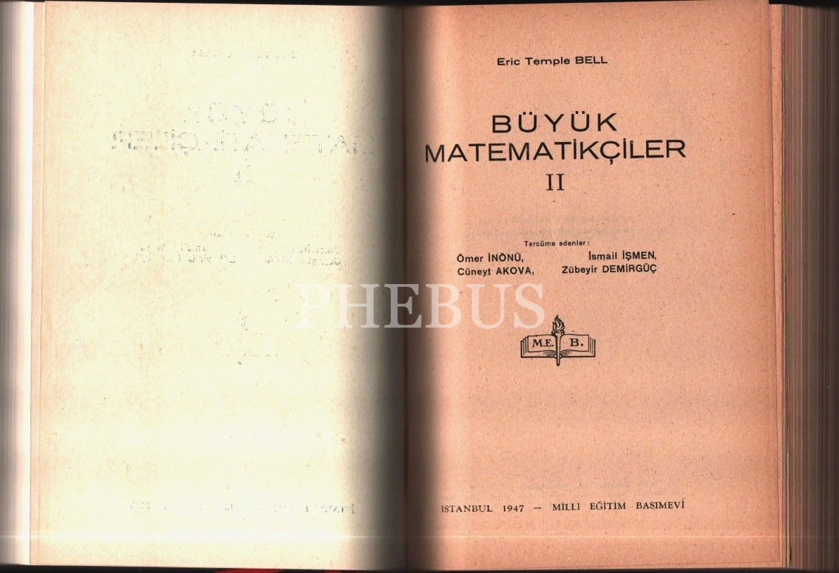 Tercüme edenlerden Erdal İnönü´ye ithaflı ve imzalı BÜYÜK MATEMATİKÇİLER (Cilt I-II), Eric Temple Bell, Millî Eğitim Basımevi, İstanbul - 1945, 281+282 sayfa, 17x24 cm