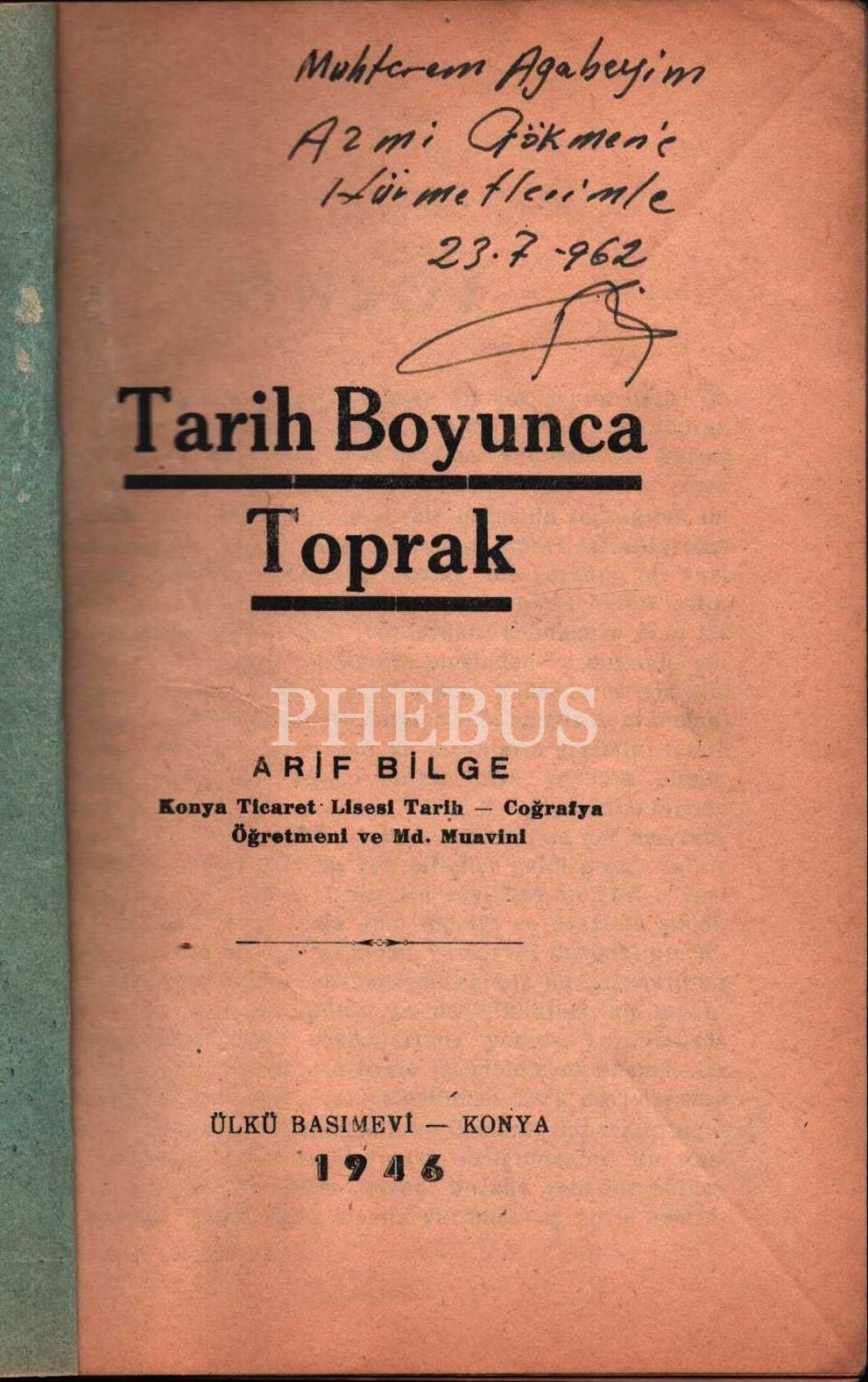 Arif Bilge´den ithaflı ve imzalı TARİH BOYUNCA TOPRAK, Ülkü Basımevi, Konya - 1946, 80 sayfa, 16x22 cm