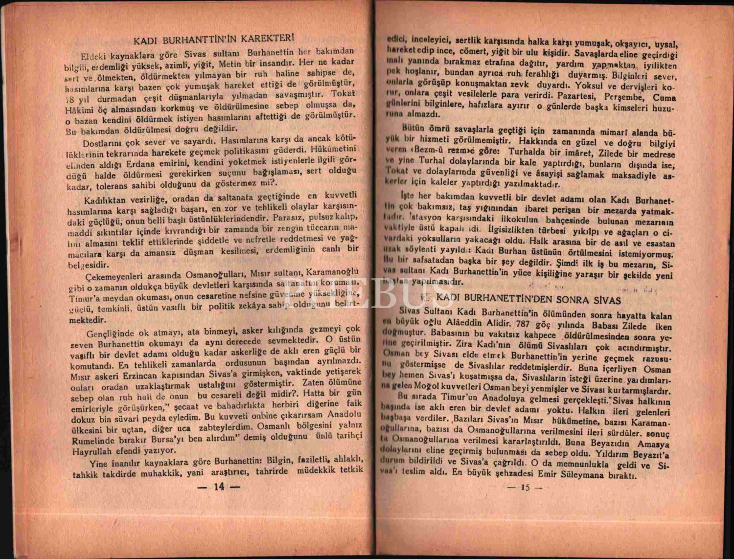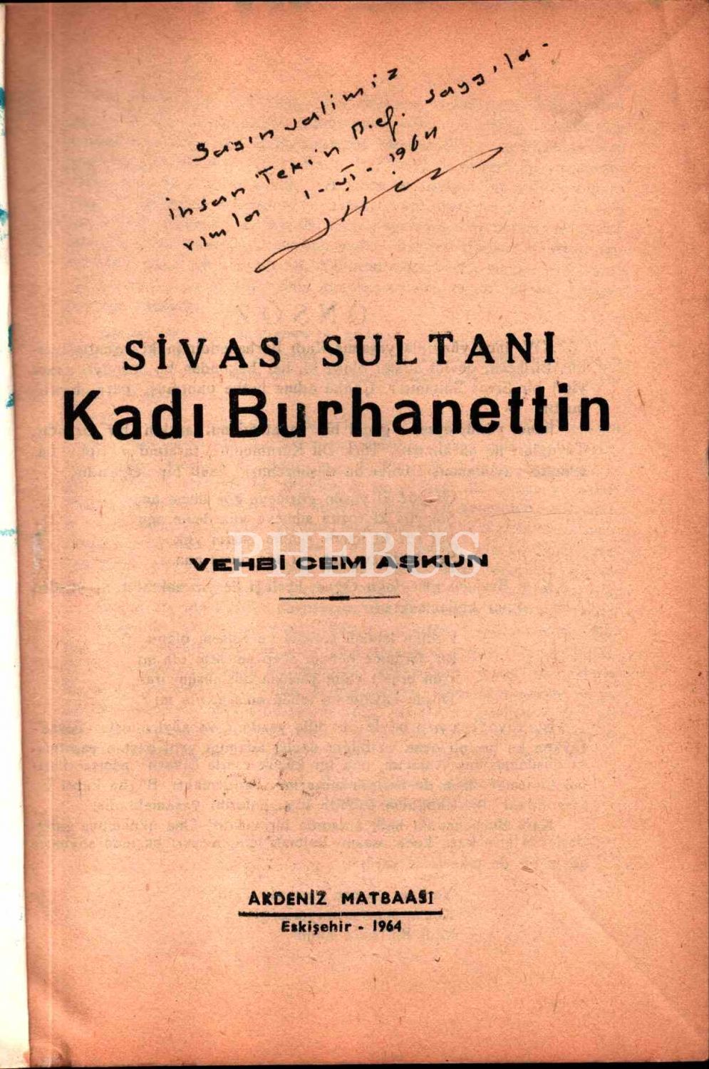 Vehbi Cem Aşkun´dan Eskişehir Valisi İhsan Tekin´e ithaflı ve imzalı SİVAS SULTANI KADI BURHANETTİN, Akdeniz Matbaası, Eskişehir - 1964, 40 sayfa, 17x24 cm