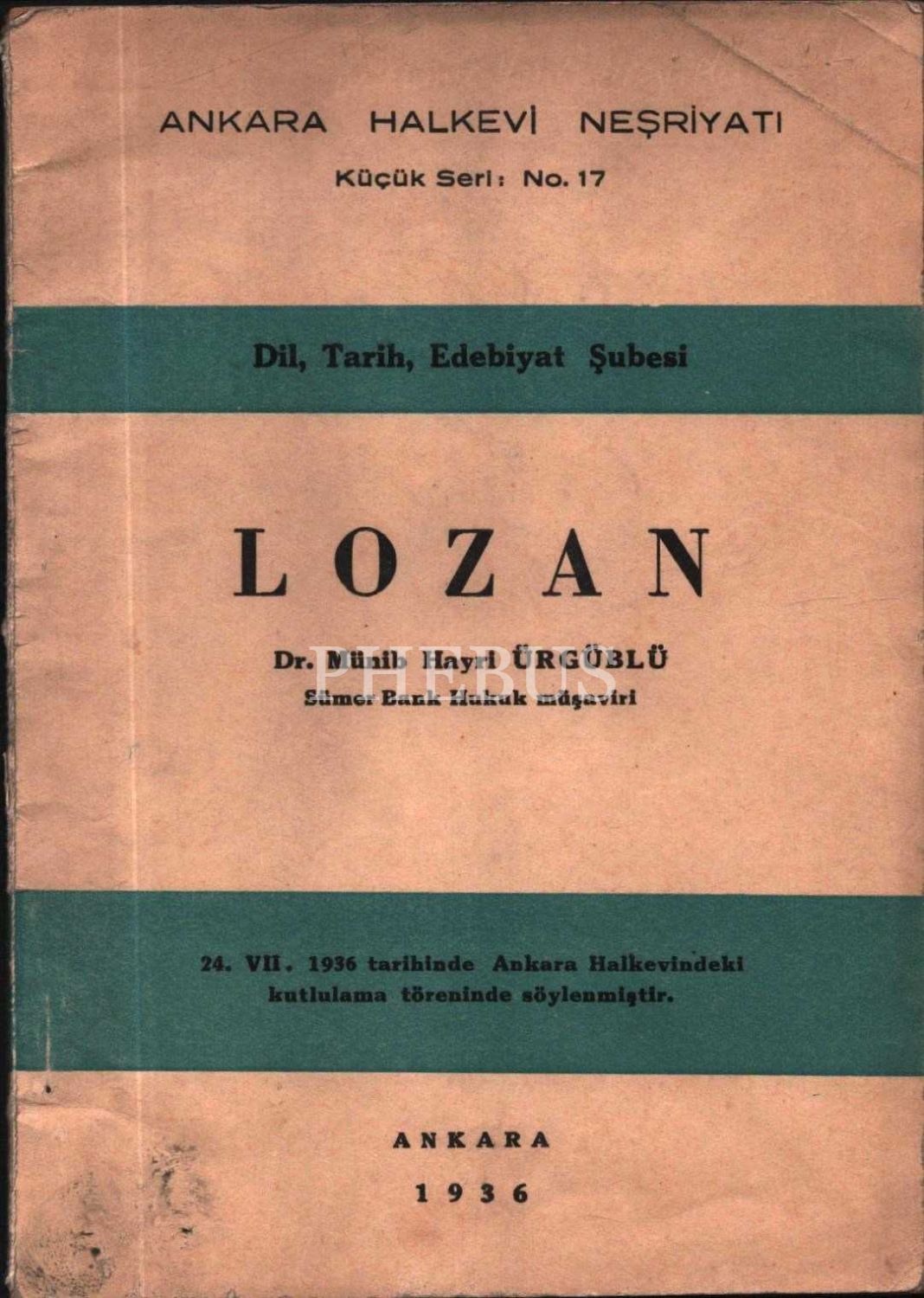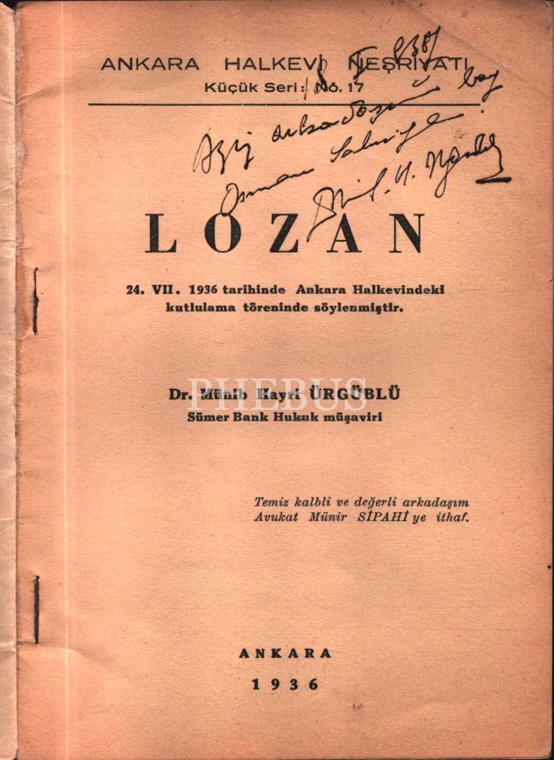 Münib Hayri Ürgüblü´den ithaflı ve imzalı LOZAN (24. VII. 1936 tarihinde Ankara Halkevindeki Kutlulama Töreninde Söylenmiştir.), Ankara Halkevi Neşriyatı, Ankara - 1936, 27 sayfa, 14x20 cm