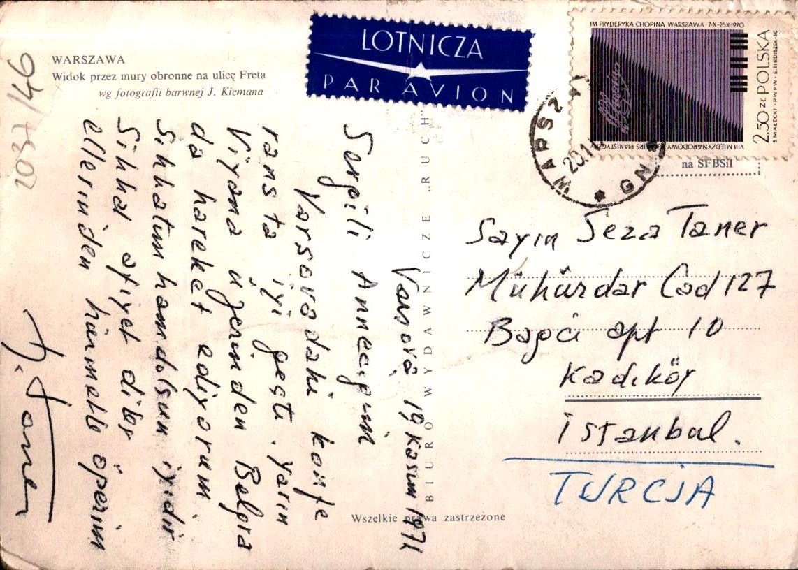 "Varşova 19 Kasım 1971 - Sevgili Anneciğim, Varşovadaki konferansta iyi geçti. Yarın Viyana üzerinden Belgrada hareket ediyorum. Sıhhatim hamdolsun iyidir. Sıhhat afiyet diler, ellerinden hürmetle öperim. H. Taner"