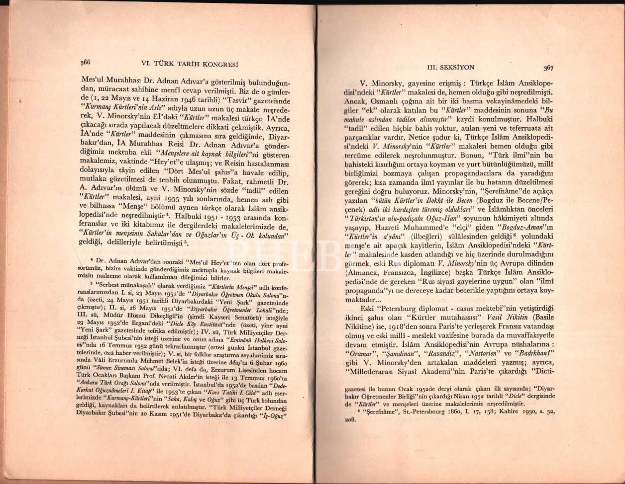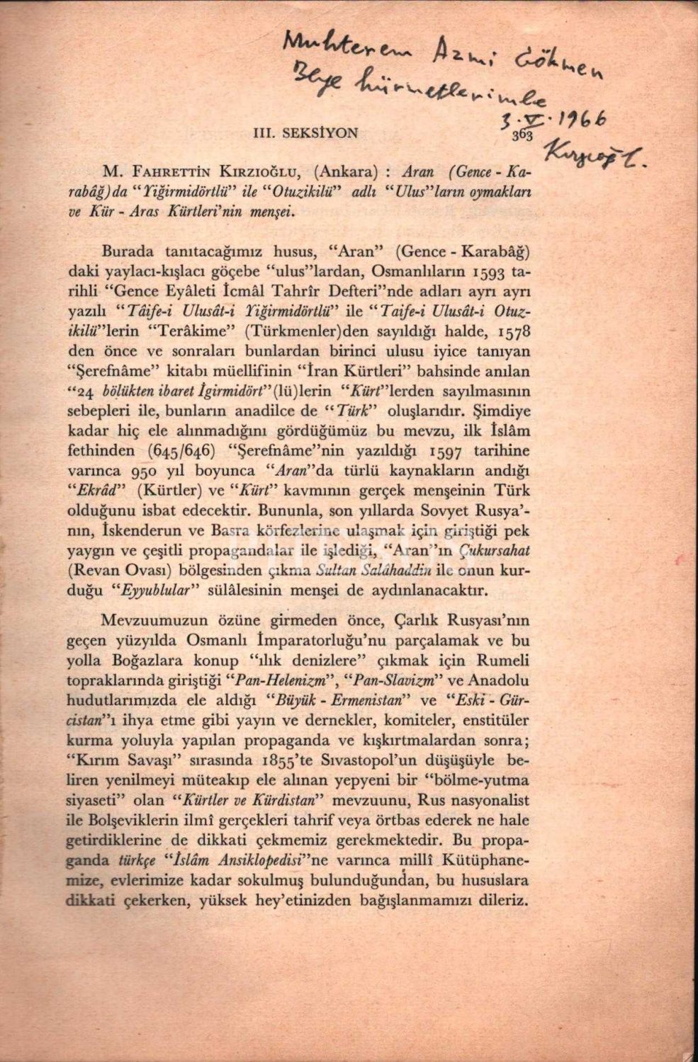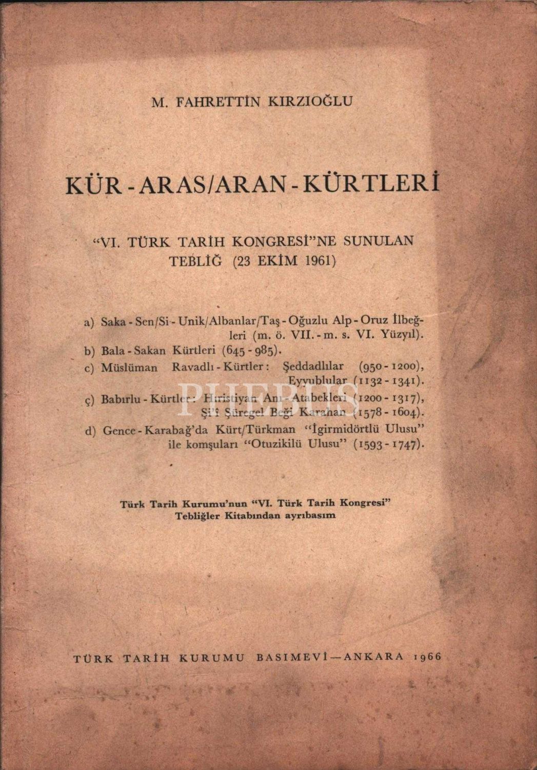 M. Fahrettin Kırzıoğlu´ndan ithaflı ve imzalı KÜR-ARAS/ARAN-KÜRTLERİ (VI. Türk Tarih Kongresi´ne Sunulan Tebliğ - 23 Ekim 1961), Türk Tarih Kurumu Basımevi, Ankara - 1966, 49 sayfa, 17x24 cm