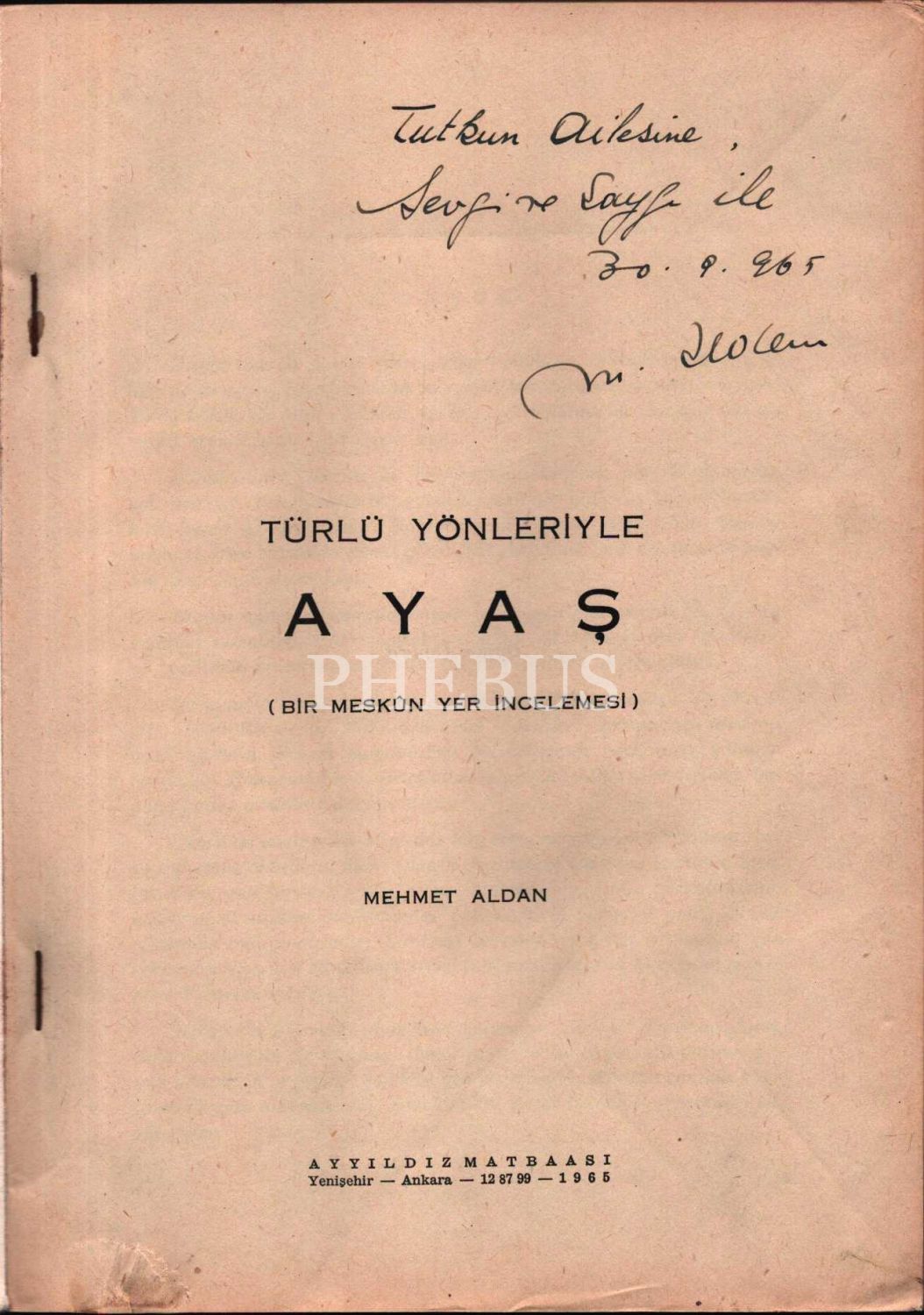 Mehmet Aldan´dan ithaflı ve imzalı TÜRLÜ YÖNLERİYLE AYAŞ (Bir Meskûn Yer İncelemesi), Ayyıldız Matbaası, Ankara - 1965, 236 sayfa, 17x24 cm