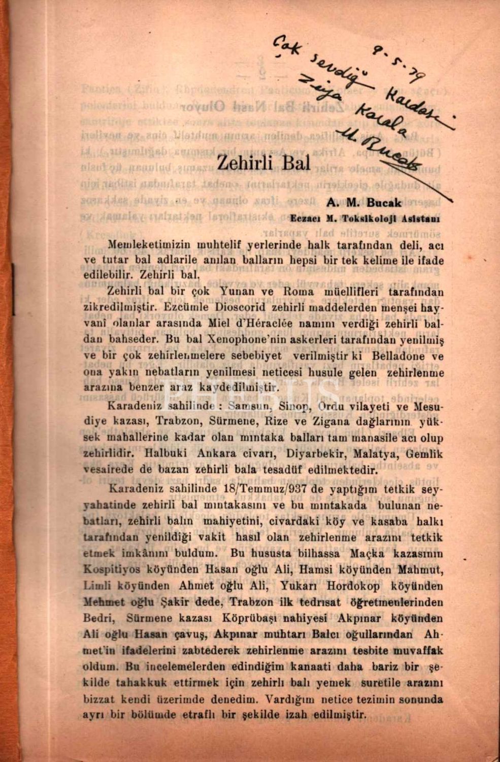 İthaf, "9.5.39 Çok sevdiğim kardeşim Ziya Karal´a M. Bucak" şeklindedir.