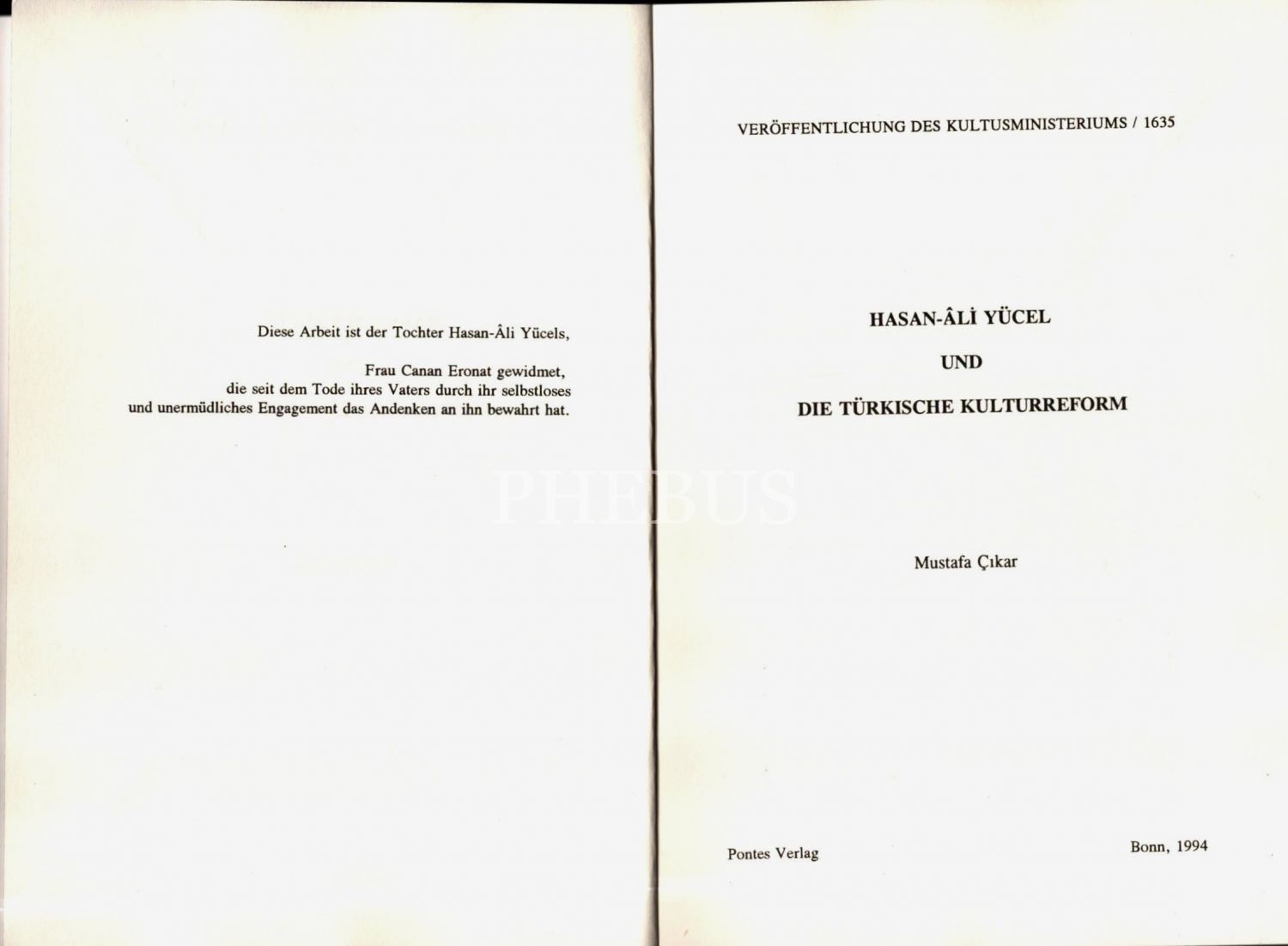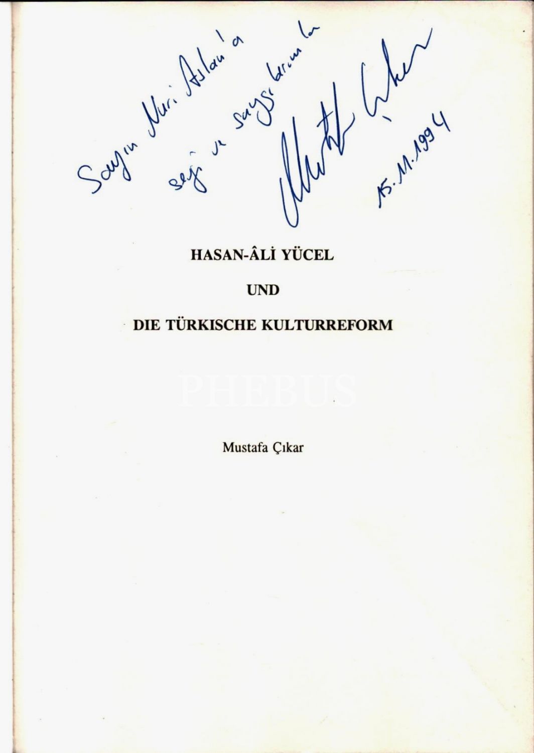 Mustafa Çıkar´dan ithaflı ve imzalı HASAN-ÂLİ YÜCEL UND DIE TÜRKISCHE KULTURREFORM, Pontes Verlag, Bonn - 1994, 120 sayfa, 15x21 cm