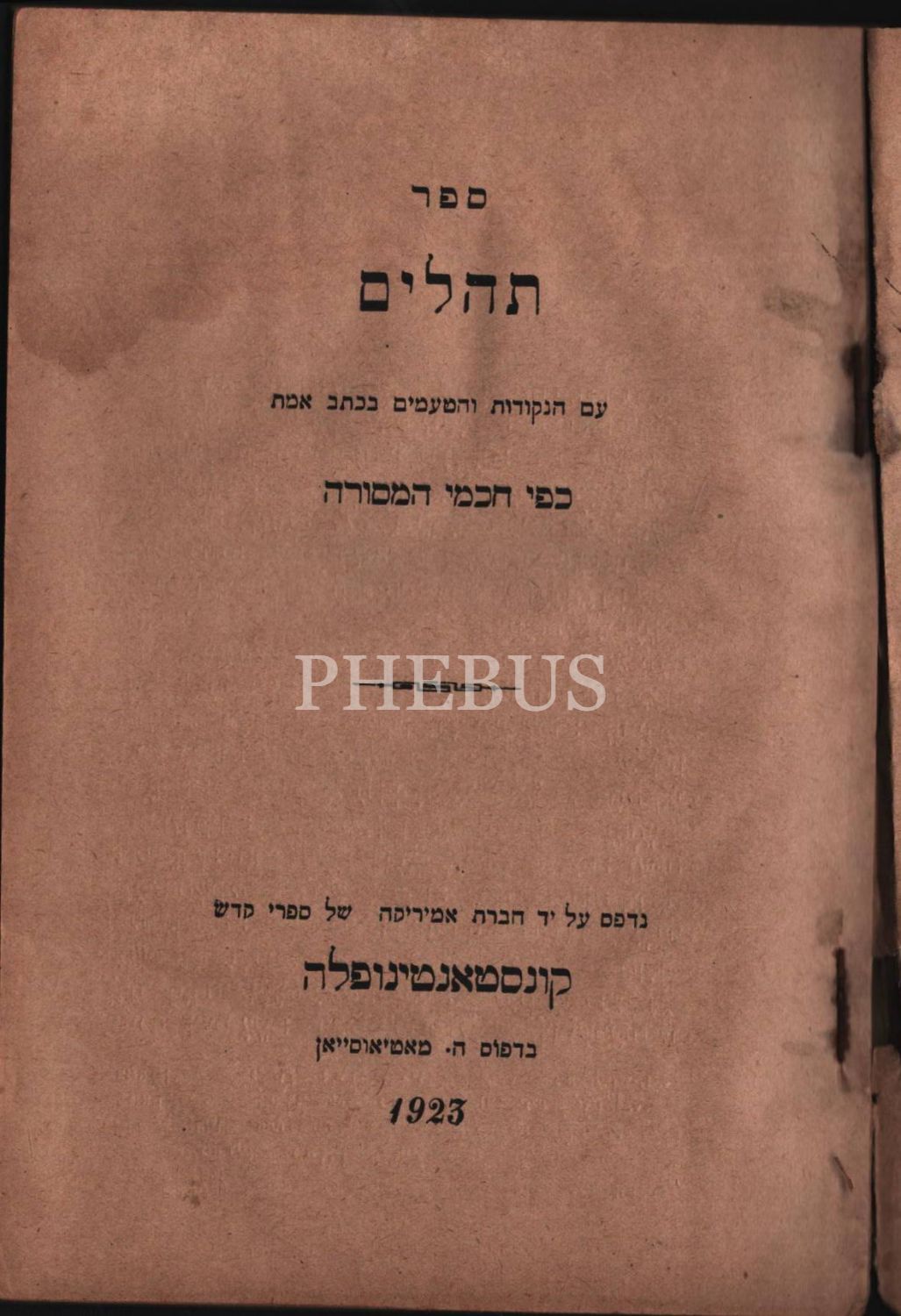 Karton cildinde SEFER TEHİLİM (תְהִלִּים) [Psalms, Hahamlar Tarafından Yazılı Nesilden Nesile Aktarılan Övgü Kitabı], Amerikan Kitab-ı Mukaddes Kurumu, Mateossian Matbaası, Constantinople 1923, 14x20 cm