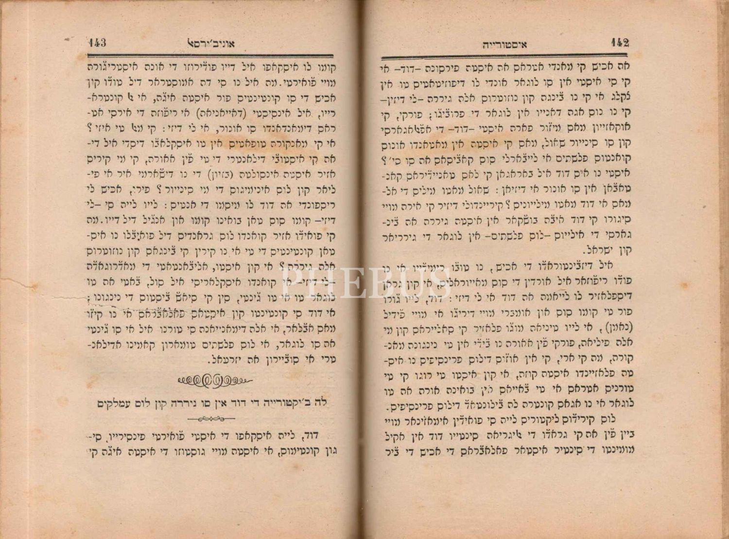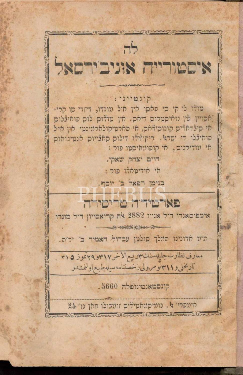 Ladino dilinde LA HİSTORİA UNİVERSAL [Genel Yahudi Tarihi- 3. Bölüm], Constantinople 1900 (5660), 359 s., 14x20,5 cm