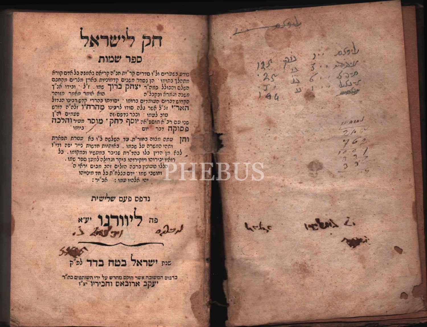 Deri cildinde SEFER HOK LEİSRAEL ( ספר חוק לישראל ), Sefer Shemot (שְׁמוֹת‎ ), Yaakov Arovas ve Arkadaşları Basımevi, Livorno/İtalya, 3. baskı, 356 s., 12x18,5 cm