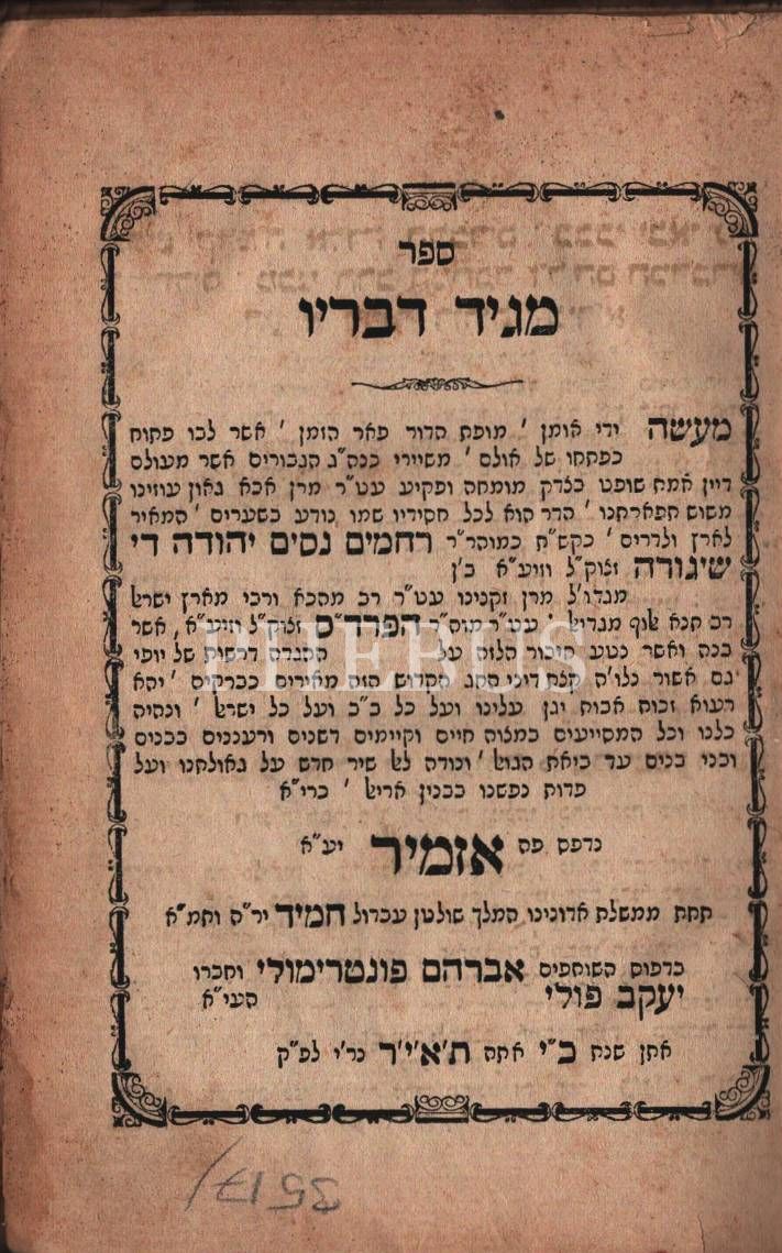 Deri cildinde SEFER MAGİD DEVARAV, İzmir Avram Pontrimoli ve Ort. Yaakov Poli Basımevi, 208 s., 14,5x21 cm