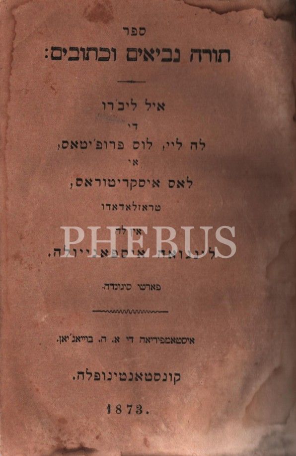 Sırtı deri karton cildinde Ladino tercümeli TANAKH (תַּנַ״ךְ‎) ( Neviʾim - Ketuvim, 2. Kısım), Boyacıyan Matbaası, Constantinople 1873, 1264 s., 14x21 cm