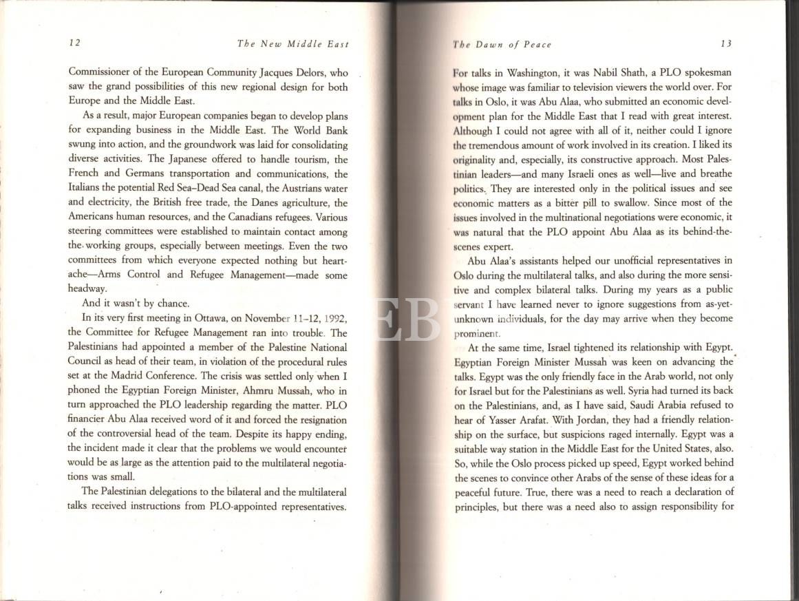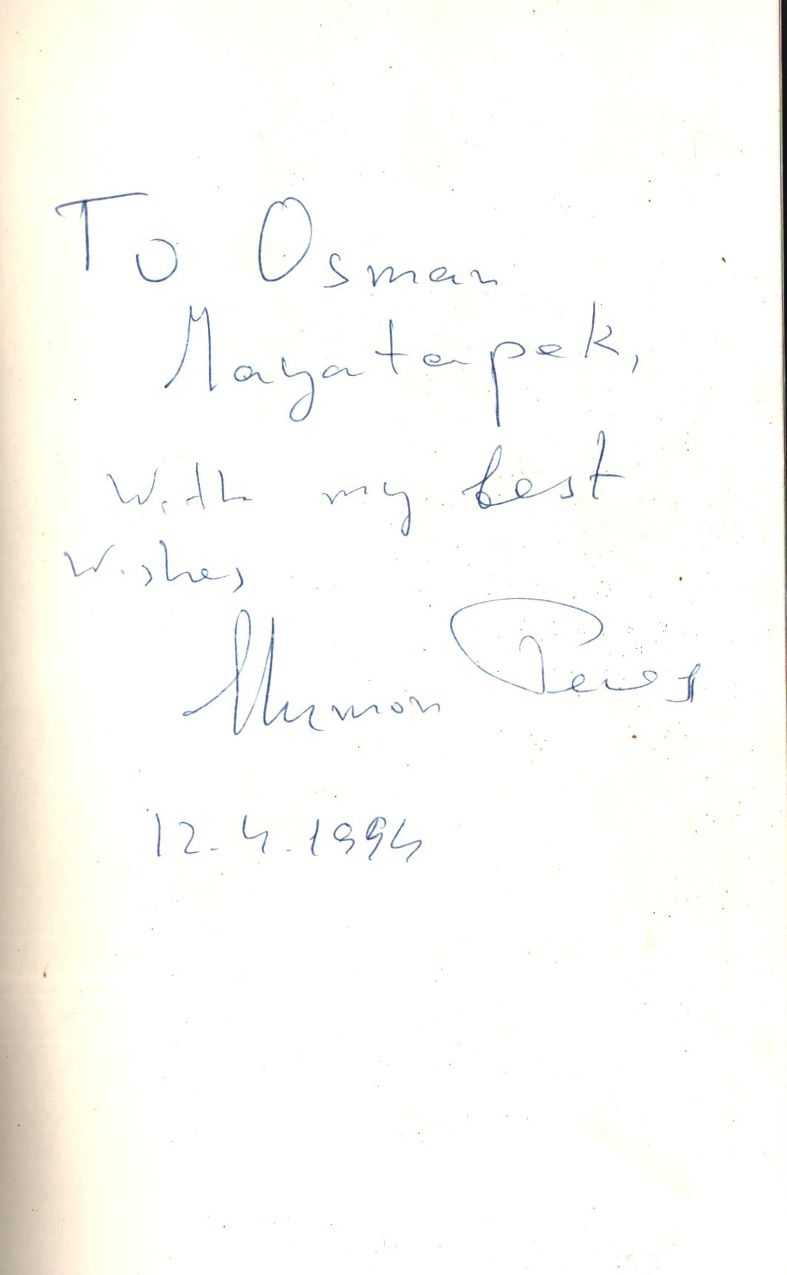 Yazarından "To Osman Mayatepek, With my best wishes 12.4.1994" ibaresi ile imzalı ve ithaflıdır. Şömizlidir. *Şimon Peres (שִׁמְעוֹן פֶּרֶס) İsrailli siyasetçi ve 9. İsrail Cumhurbaşkanıdır. 66 yılı aşan siyaset kariyeri boyunca 12 kabinede üye olarak görev aldı. Peres, İsrail devletinin yasama organı Knesset’e 1959 Kasım´ında seçildi ve 2006 yılının başlarındaki üç aylık bir ara dışında, 2007 yılında cumhurbaşkanı seçilene kadar görev başında kaldı. İsrail Bağımsızlık Savaşı esnasında birçok diplomatik ve askeri görevlerde bulundu. Kariyeri boyunca Knesset’te beş farklı partide görev aldı. 1994 yılında, Yaser Arafat ve İzak Rabin’le birlikte barış anlaşması girişimine Dışişleri Bakanı olarak katılmasından dolayı Nobel Barış Ödülü kazandı. 15 Temmuz 2007’de yemin ederek yedi yıllık cumhurbaşkanlığı görevine başladı. Başbakanlıktan sonra cumhurbaşkanlığı görevine seçilen ilk politikacı oldu.